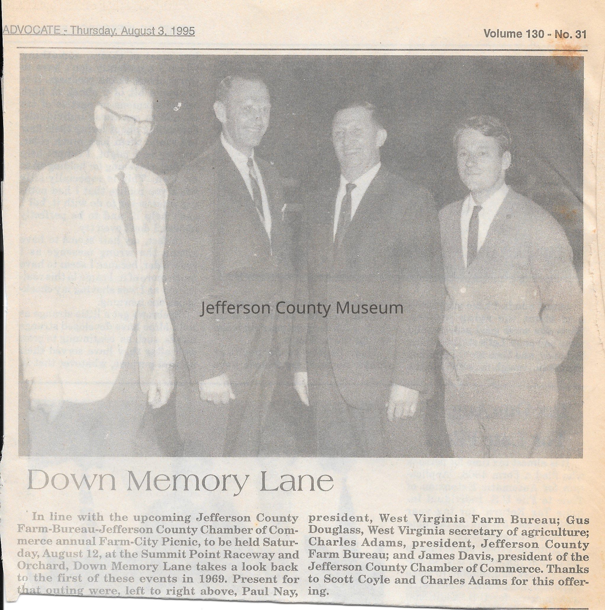 IMG3908080: Jefferson County Farm Bureau-Jefferson County Chamber of Commerce annual Farm-City Picnic attendees, 1969. From left: Paul Nay, president of West Virginia Farm Bureau; Gus Douglass, West Virginia secretary of agriculture; Charles Adams, president of Jefferson County Farm Bureau; James Davis, president of Jefferson County Chamber of Commerce.