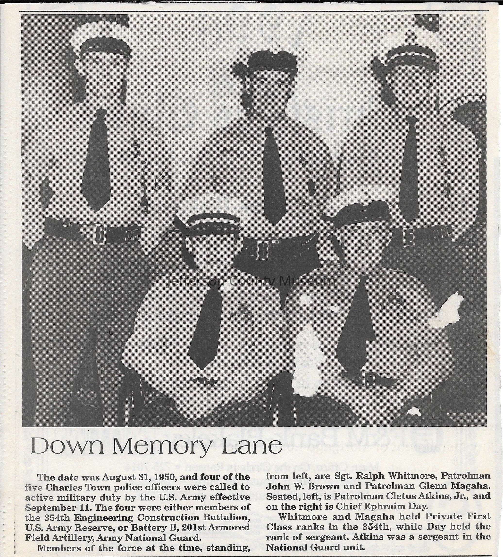 IMG3908041: Charles Town Police Officers, August 31, 1950. Four of the five were called to active military duty by the U.S. Army. Front row, from left: Patrolman Cletus Atkins, Jr.; Chief Ephraim Day. Back row, from left: Sgt. Ralph Whitmore; Patrolman John W. Brown; Patrolman Glenn Magaha. Whitmore and Magaha held Private First Class ranks in the 354th Engineering Construction Battalion, U.S. Army Reserves. Day held the rank of sergeant in the 354th Engineering Construction Battalion, U.S. Army Reserves. Atkins was a sergeant in Battery B, 201st Armored Field Artillery, Army National Guard.