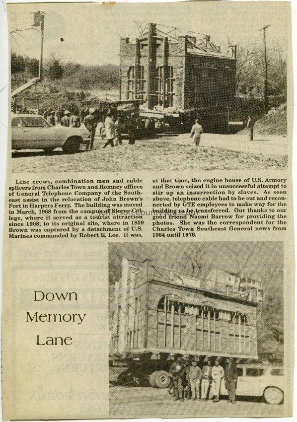 IMG3908085: Line crews, combination men, and cable splicers from Charles Town and Romney offices of General Telephone Company of the Southeast assist in the relocation of John Brown's Fort from the Storer College campus to its original site in the Lower Town of Harpers Ferry, March 1968.