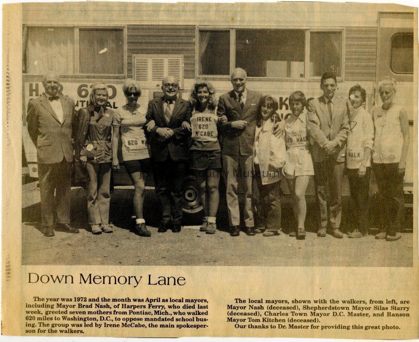 IMG3908088: Local mayors with seven mothers from Pontiac, Mich., who walked 620 miles to Washington, D.C., to opposed mandated school busing, 1972. From left: Mayor Brad Nash, of Harpers Ferry; unidentified; unidentified; Mayor Silas Starry, of Shepherdstown; Irene McCabe; Mayor D. C. Master, of Charles Town; unidentified; unidentified; Mayor Tom Kitchen, of Ranson; unidentified; unidentified.