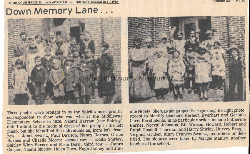 IMG3908090: Students at Middleway Elementary School, 1928. Left photo: Front row, from left: Janet Swartz, Paul Dawson, Nancy Barnes, Grace Barnes, Charlie Moore. Second row, from left: Edith Shirley, Shirley Winn Barnes, Elsie Dorn. Third row, from left: James Carper, Naomi Shirley, Helen Dorn, Hugh Janney, Jimmie Nicely. Right photo: Shows teachers (in no particular order): Herbert Everhart and Gertude Carr. Students (in no particular order): Catherine Barnes, Norval Johnston, Bill Watson, Howard Goodell, Robert Goodell, Ralph Goodell, Thurman Shirley, Harry Shirley, Harvey Briggs, Virginia Gruber, Mary Frances Swartz, and other unidentified.