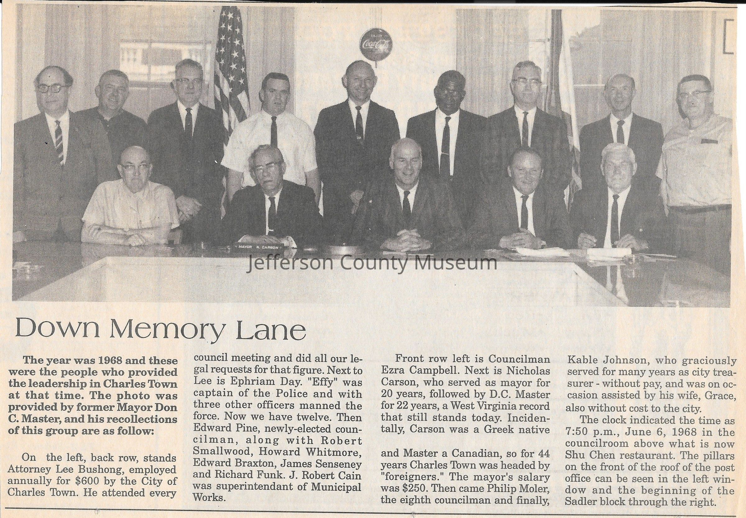 IMG3908045: Charles Town City Council members, June 6, 1968. Back row, from left: Lee Bushong, attorney; Ephraim Day, captain of Charles Town Police; Edward Pine, councilman; Robert Smallwood; Howard Whitmore; Edward Braxton; James Senseney; Richard Funk; J. Robert Cain, superintendent of Municipal Works. Front row, from left: Ezra Campbell, councilman; Nicholas Carson, mayor of Charles Town; Philip Moler, councilman; Kable Johnson, treasurer of Charles Town.