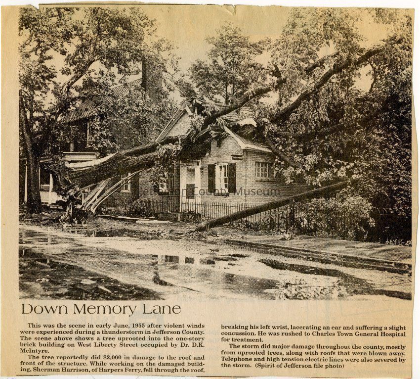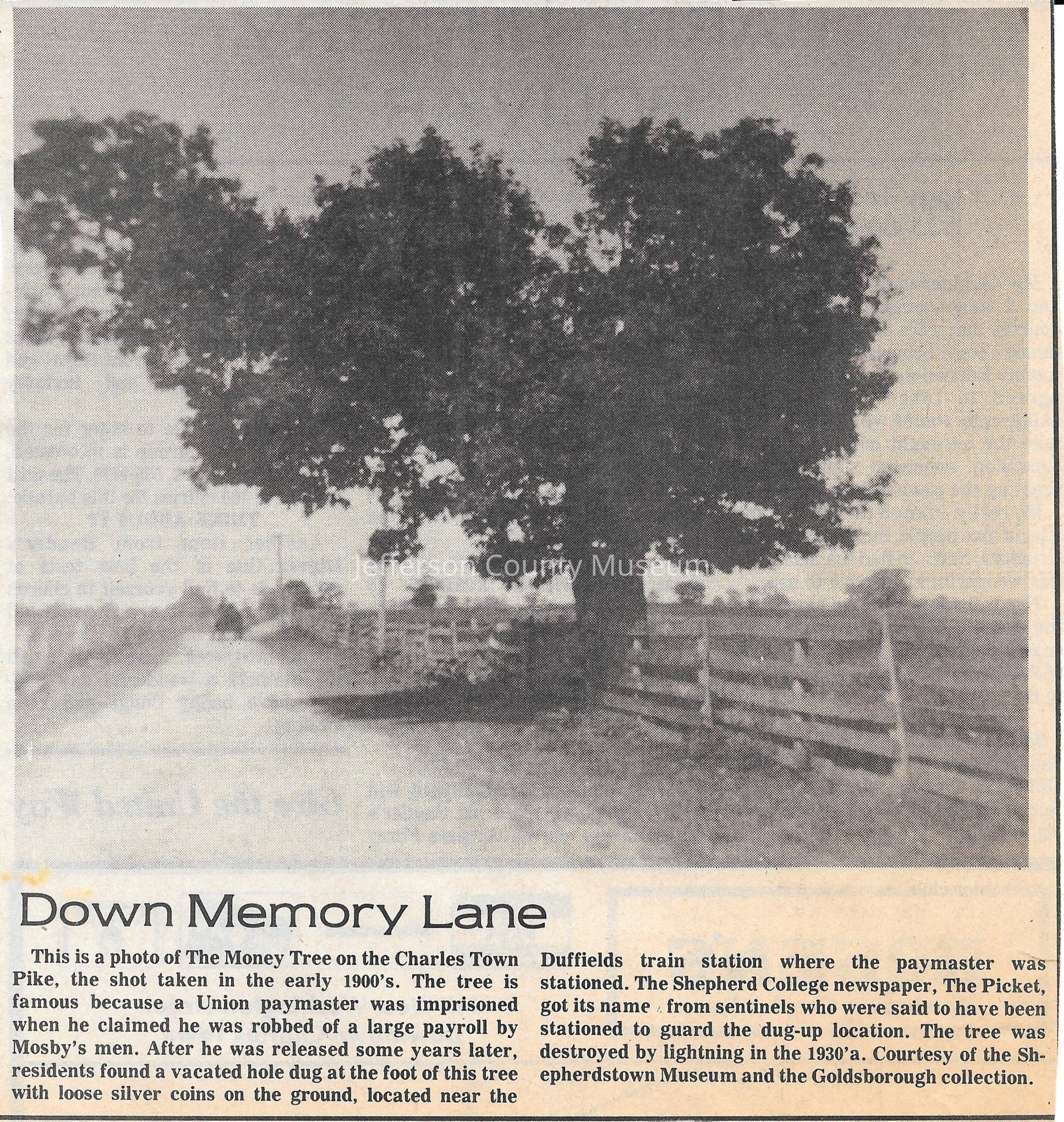 IMG3908096: Money Tree on Charles Town Pike, early 1900s. A Union paymaster was imprisoned when he claimed he was robbed of a large payroll by Mosby's men. After he was released some years later, residents found a vacated hole dug at the foot of the tree with loose silver coins on the ground around it, located near the Duffields train station where the paymaster was stationed. The tree was destroyed by lighting in the 1930s.