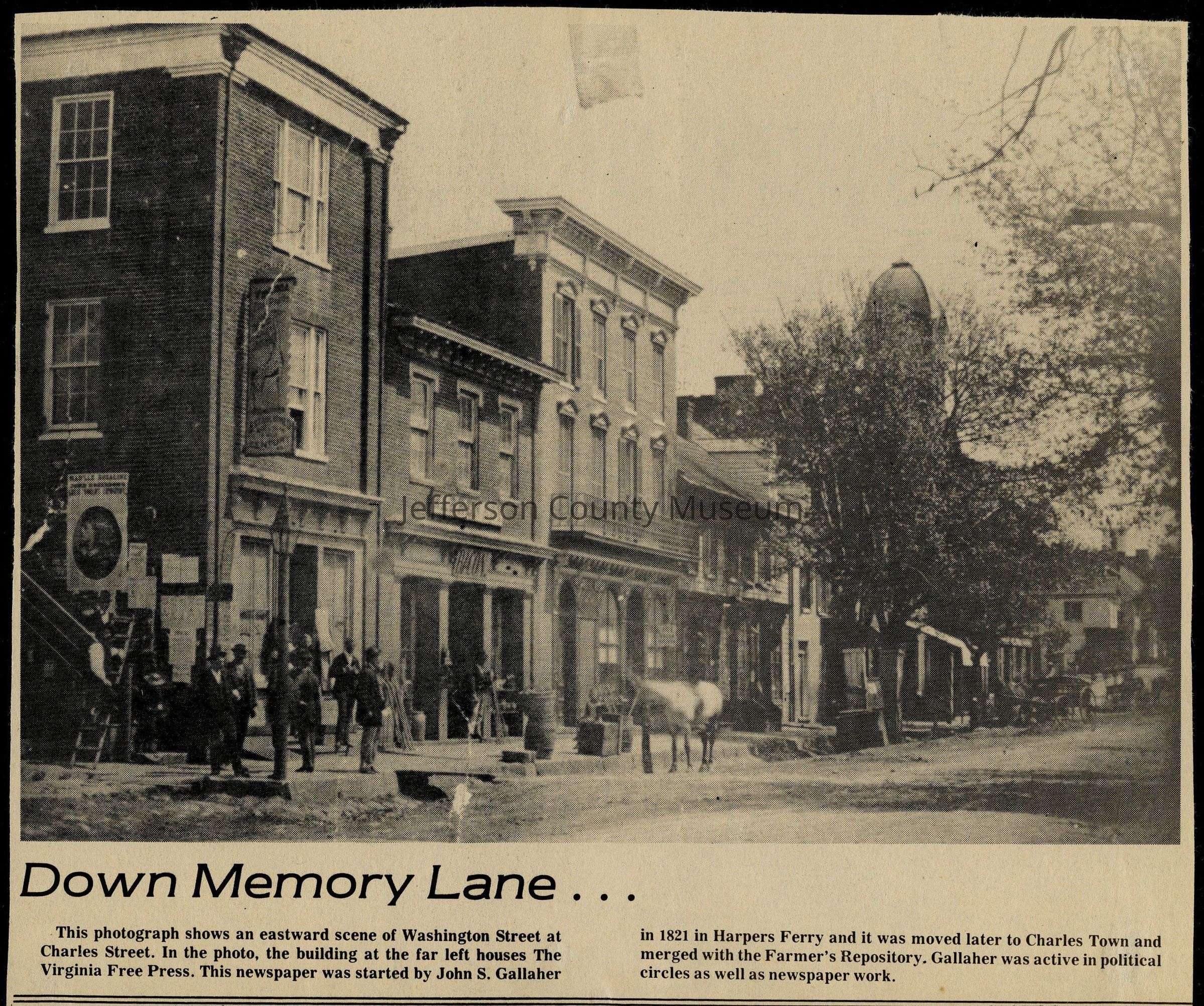 IMG3908053: Looking east on Washington Street in Charles Town. Building on far left houses The Virginia Free Press, a newspaper started by John S. Gallaher in 1821 in Harpers Ferry and moved to Charles Town where it merged with Farmer's Repository.