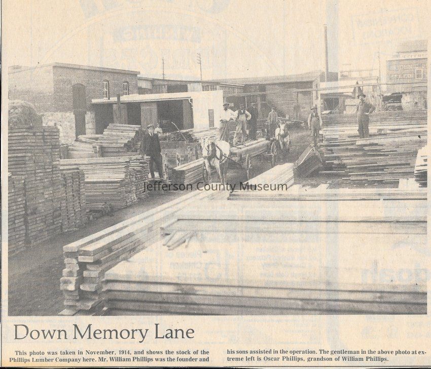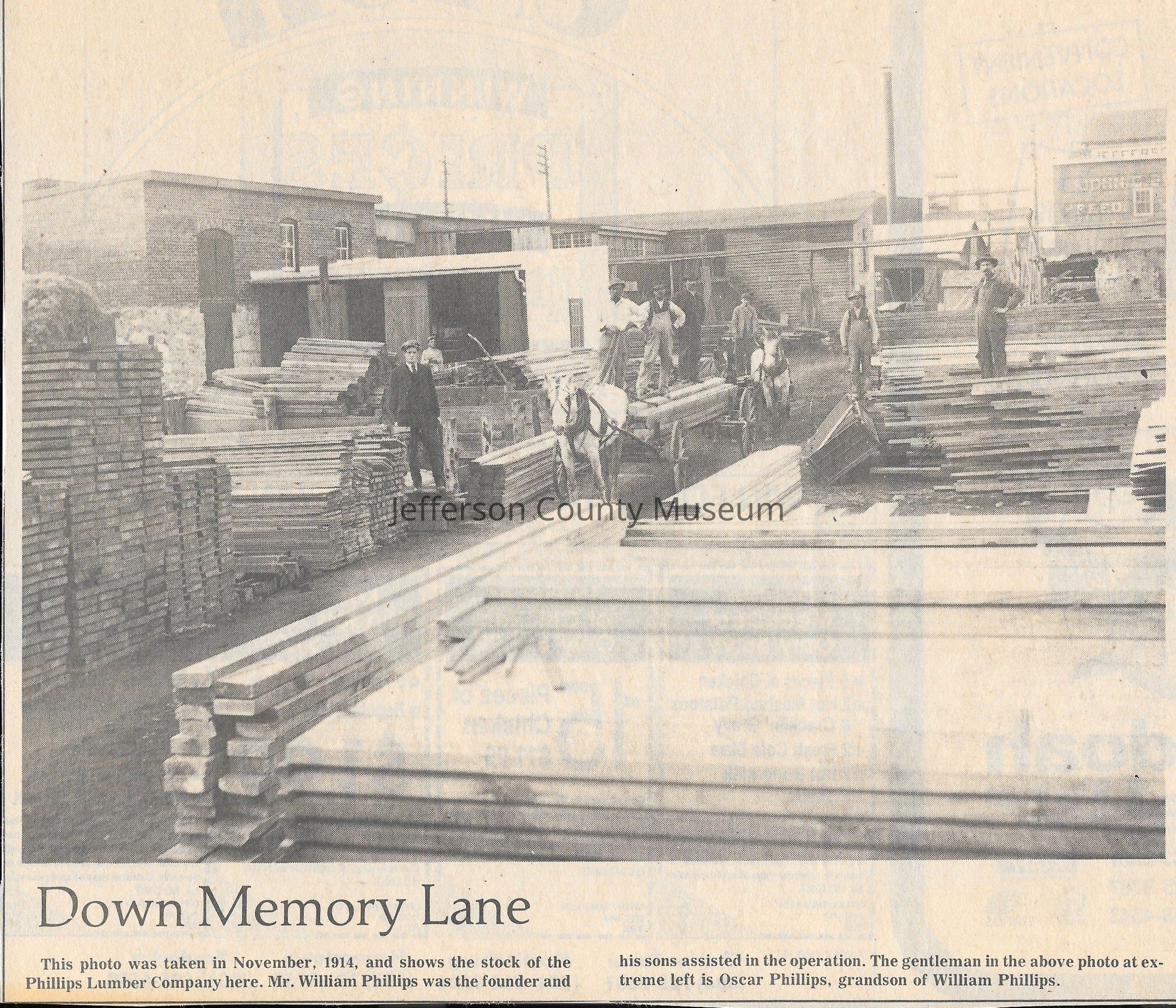 IMG3908103: Employees and stock at Phillips Lumber Company, November 1914. On far left is Oscar Phillips, grandson of William Phillips, founder of Phillips Lumber Company.