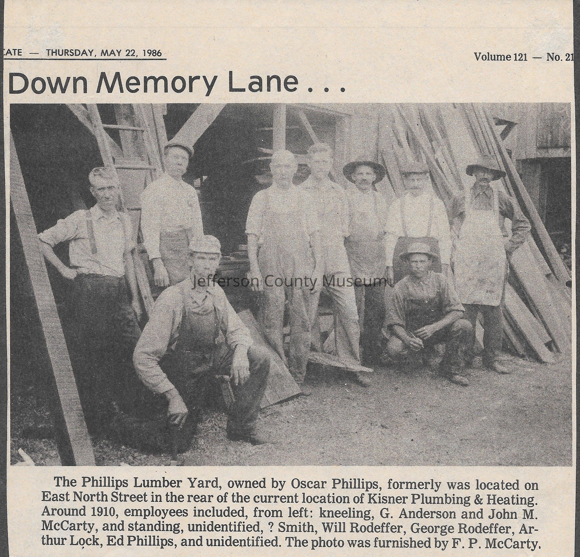 IMG3908104: Employees at Phillips Lumber Yard, owned by Oscar Phillips, circa 1910. Kneeling, from left: G. Anderson, John M. McCarty. Standing, from left: unidentified, ? Smith, Will Rodeffer, George Rodeffer, Arthur Lock, Ed Phillips, unidentified.