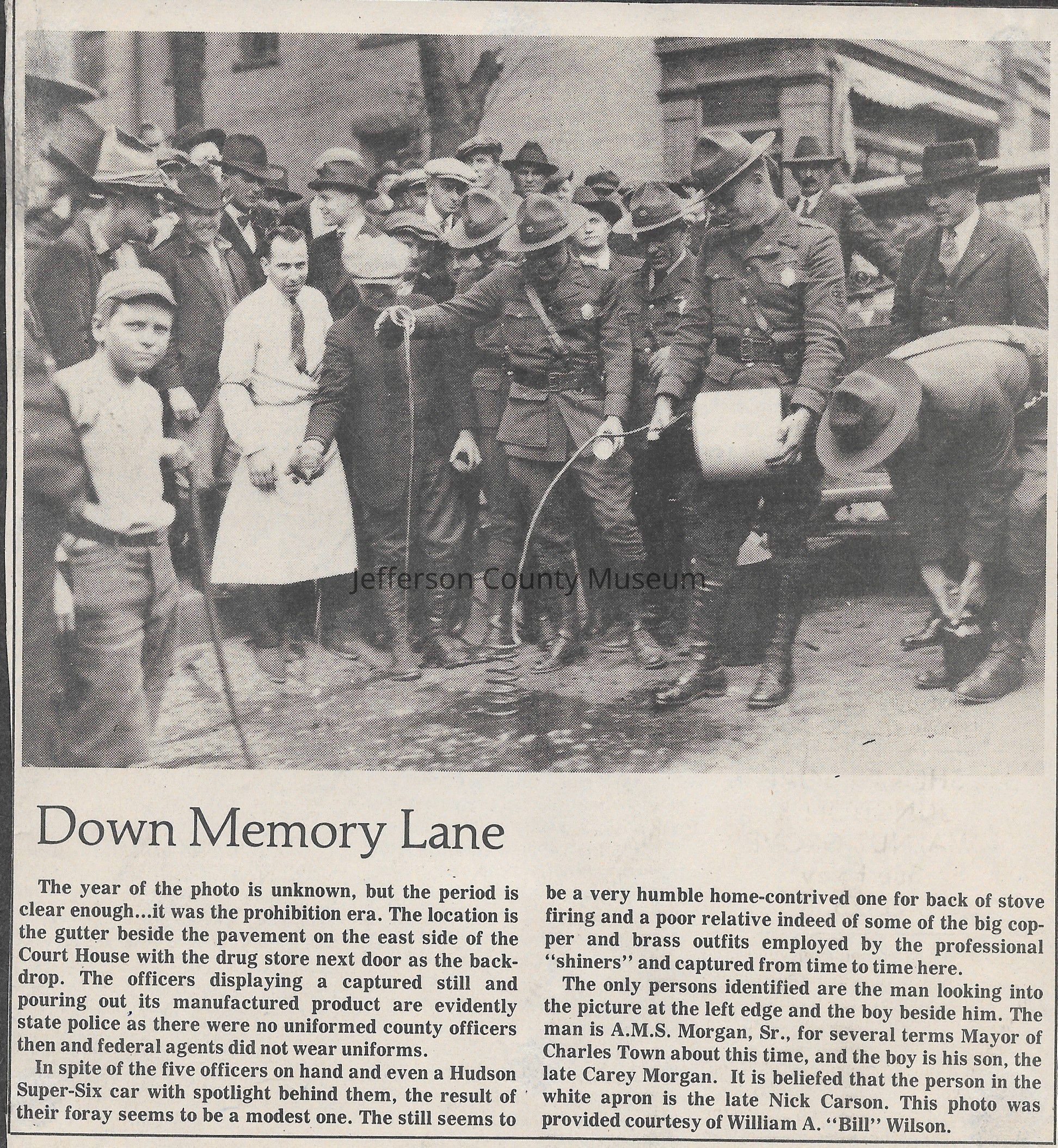 IMG3908106: Five West Virginia State Police Officers pouring out alcohol in a captured still in the gutter behind the pavement on the east side of the Jefferson County Court House, during the Prohibition Era, circa 1920s. Man looking into camera at far left is A. M. S. Morgan, Sr., Charles Town Mayor. The boy next to him is his son, Carey Morgan. Man in white apron is believed to be Nick Carson.
