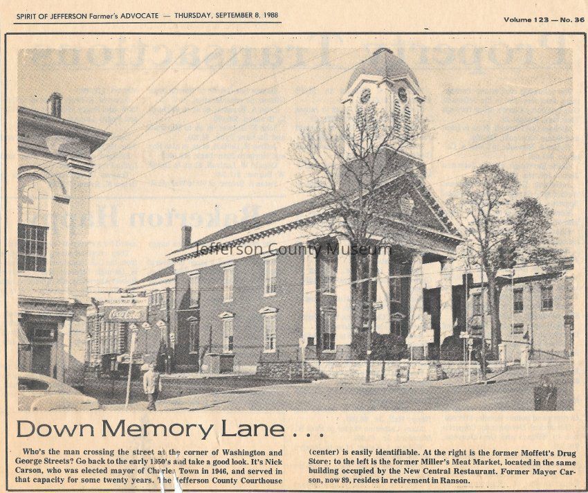 IMG3908107: Jefferson County Court House, circa 1950s. Man crossing the street at the corner of Washington and George Streets is Nick Carson, Charles Town Mayor. To the left of the Court House is the New Central Restaurant.