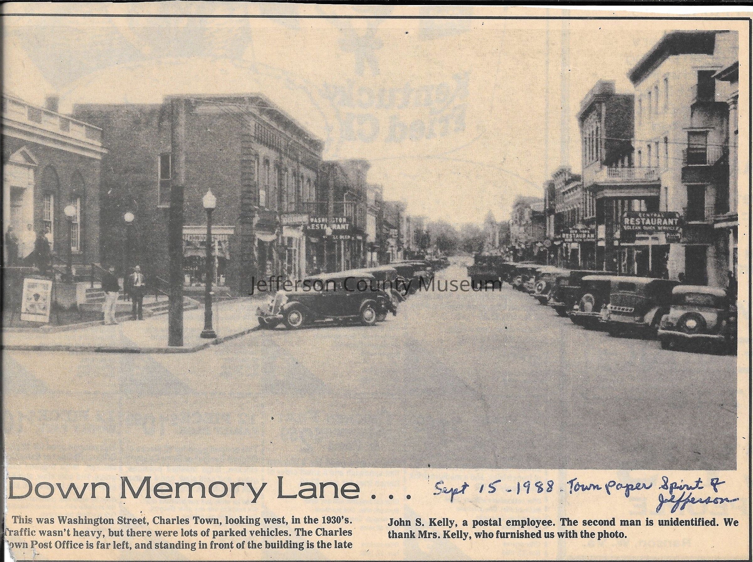 IMG3908054: Looking west on Washington Street in Charles Town, circa 1930s. Far left is Charles Town Post Office. Standing in front of the building is John S. Kelly, a postal employee. Other individual is unidentified.