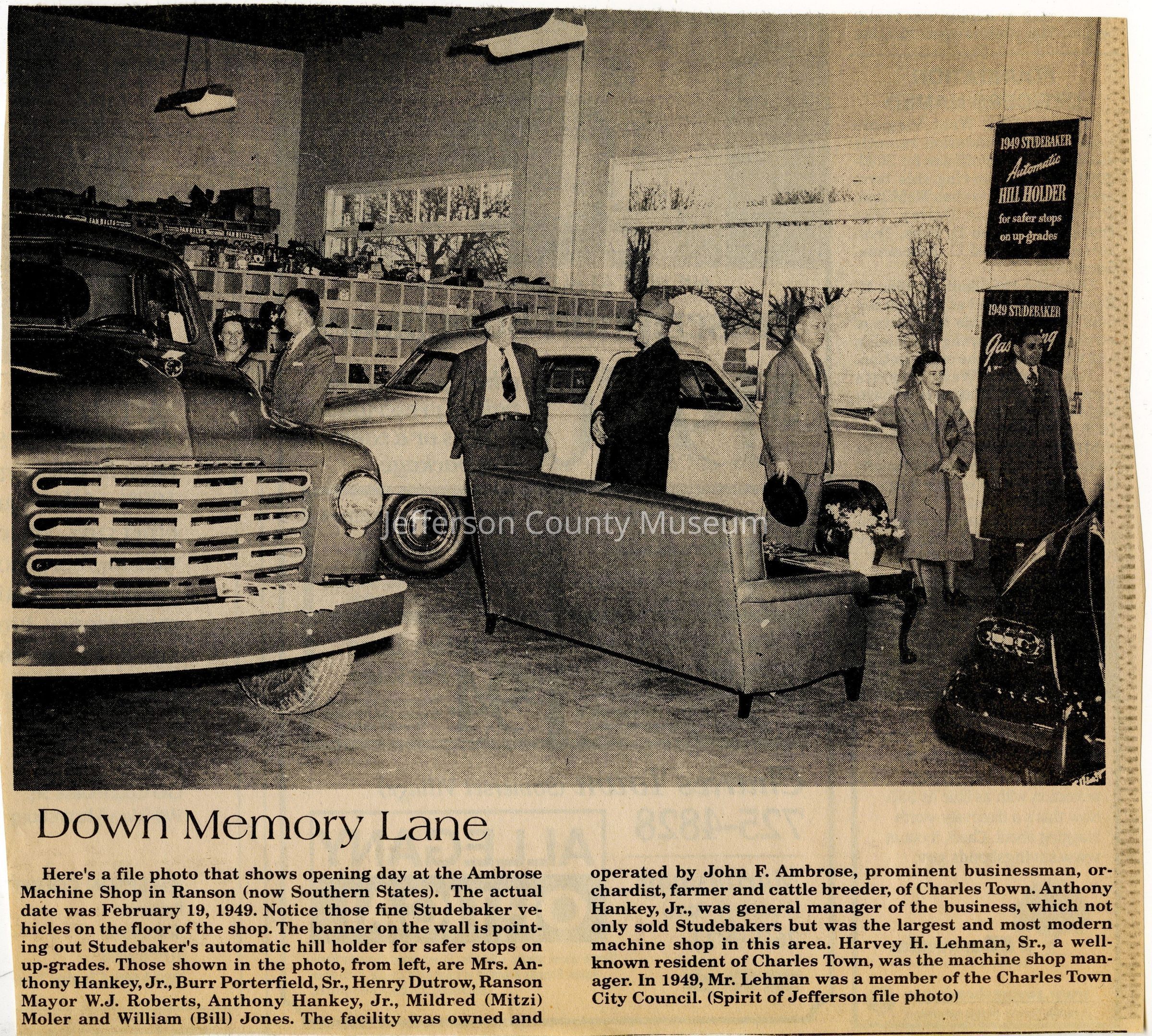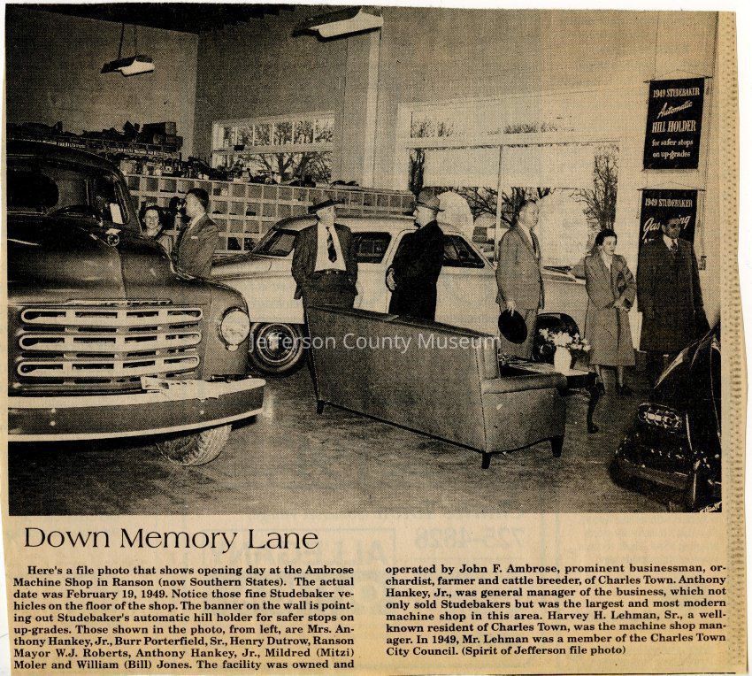 IMG3908108: Opening day at Ambrose Machine Shop in Ranson, February 19, 1949. Studebaker vehicles on the floor of the shop. The facility was owned and operated by John F. Ambrose. From left: Mrs. Anthony Hankey, Jr.; Burr Porterfield, Sr.; Henry Dutrow; W. J. Roberts, Ranson Mayor; Anthony Hankey, Jr., General Manager; Mildred (Mitzi) Moler; William (Bill) Jones.