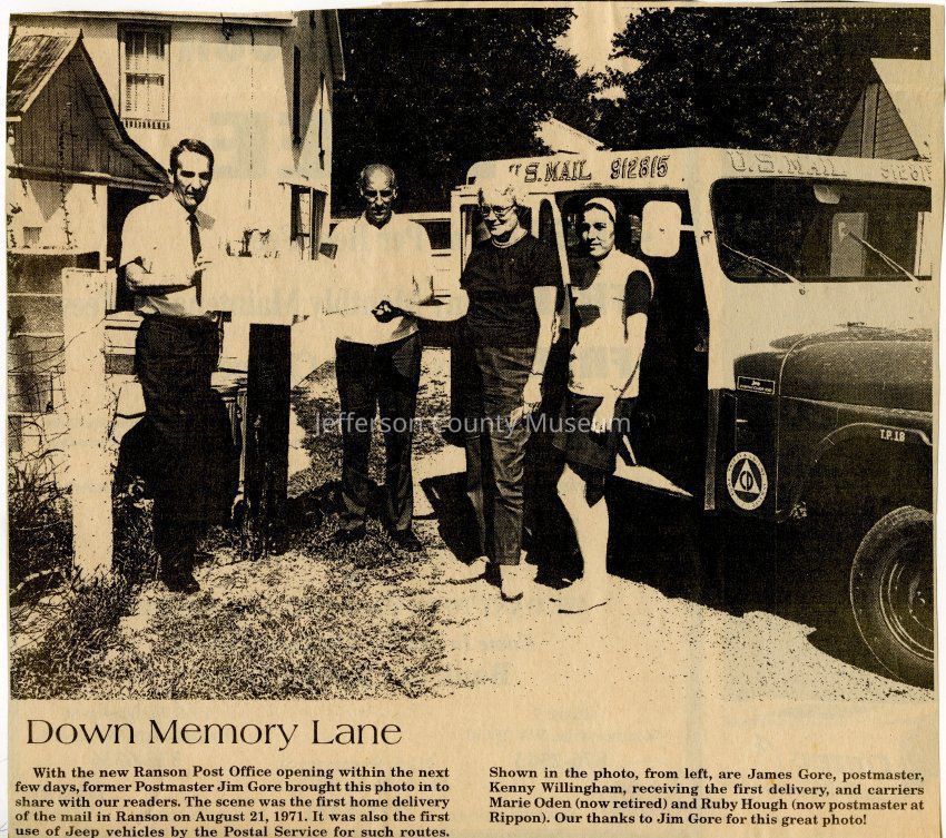IMG3908110: First home delivery of mail in Ranson, August 21, 1971. First use of Jeep vehicles by the Postal Service for such routes. From left: James Gore, postmaster; Kenny Willingham, receiving the first delivery; Marie Oden, carrier; Ruby Hough, carrier.