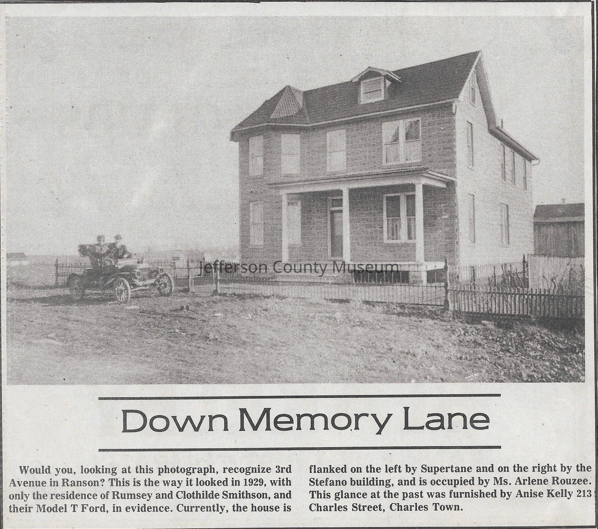 IMG3908111: Residence of Rumsey and Clothilde Smithson on 3rd Avenue in Ranson, 1929. Rumsey and Clothilde Smithson pictured in their Model T Ford in front of their home.