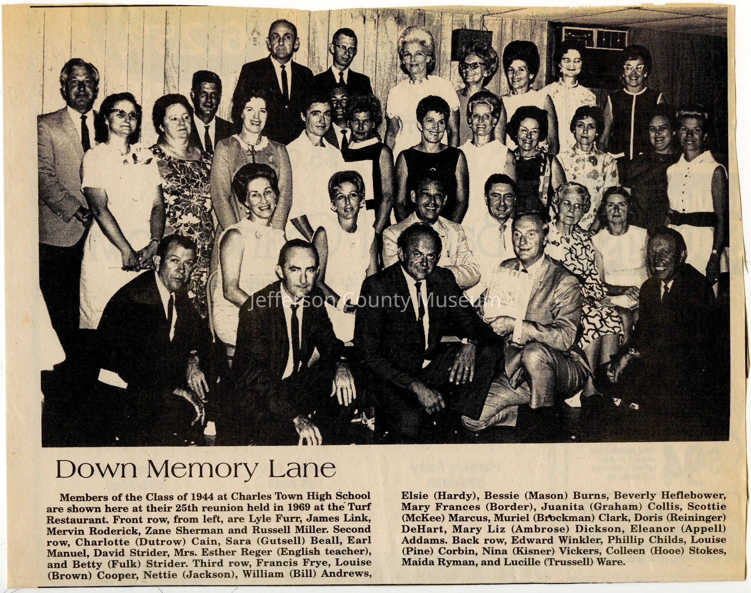 IMG3908058: Charles Town High School's Class of 1944 25th reunion, held at the Turf Restaurant, 1969. Front row, from left: Lyle Furr, James Link, Mervin Roderick, Zane Sherman, Russell Miller. Second row, from left: Charlotte (Dutrow) Cain, Sara (Gutsell) Beall, Earl Manuel, David Strider, Esther Reger (English teacher), Betty (Fulk) Strider. Third row, from left: Francis Frye, Louise (Brown) Cooper, Nettie (Jackson), William (Bill) Andrews, Elsie (Hardy), Bessie (Mason) Burns, Beverly Heflebower, Mary Frances (Border), Juanita (Graham) Collis, Scottie (McKee) Marcus, Muriel (Brockman) Clark, Doris (Reininger) DeHart, Mary Liz (Ambrose) Dickson, Eleanor (Appell) Addams. Back row, from left: Edward Winkler, Phillip Childs, Louise (Pine) Corbin, Nina (Kisner) Vickers, Colleen (Hooe) Stokes, Maida Ryman, Lucille (Trussell) Ware.