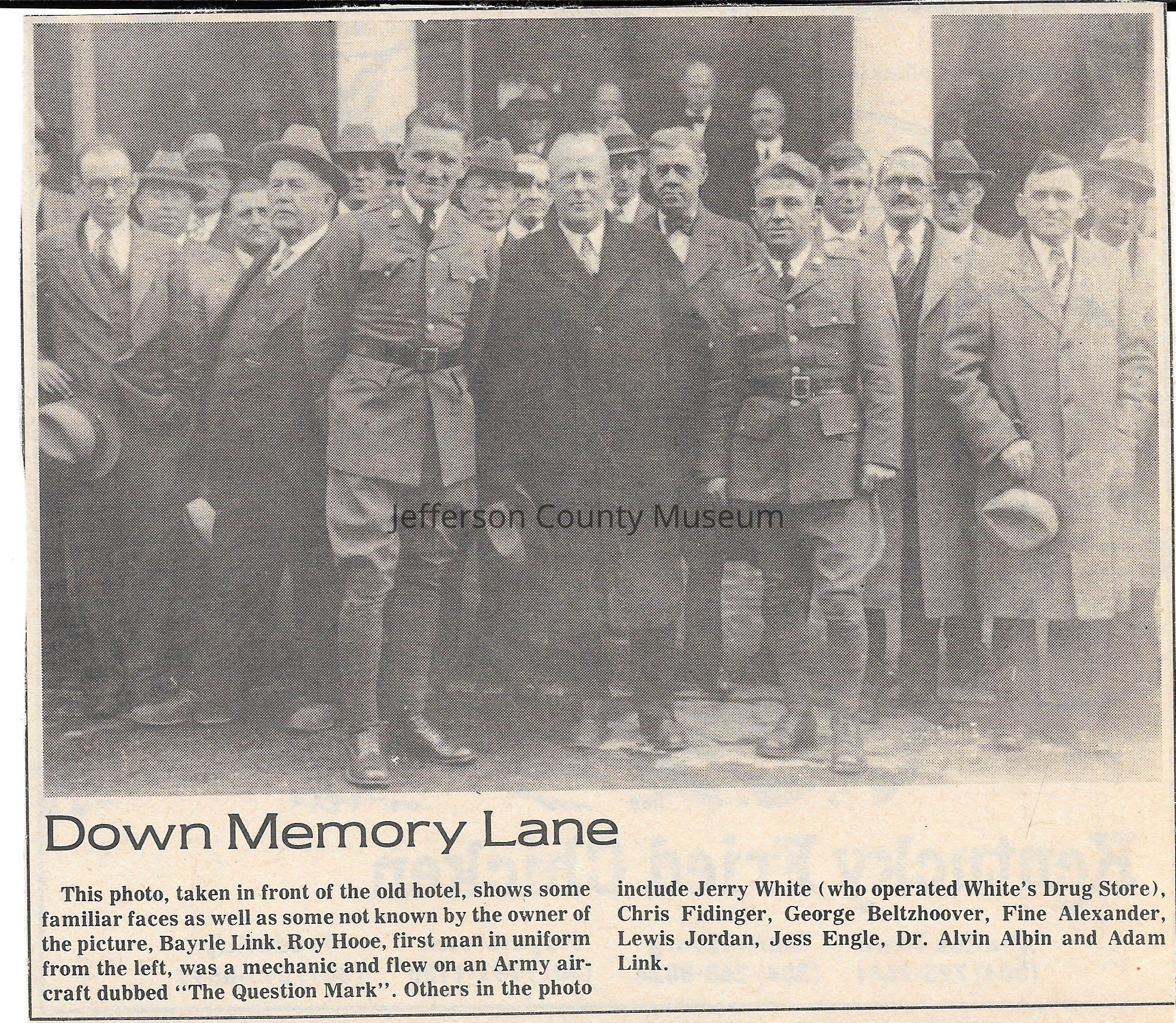 IMG3908117: Individuals standing in front of Thomas Jefferson Hotel in Charles Town. First man in uniform from left is Roy Hooe, mechanic who flew on Army aircraft "The Question Mark". Others in the photo (in no particular order): Jerry White, Chris Fidinger, George Beltzhoover, Fine Alexander, Lewis Jordan, Jess Engle, Dr. Alvin Albin, Adam Link.
