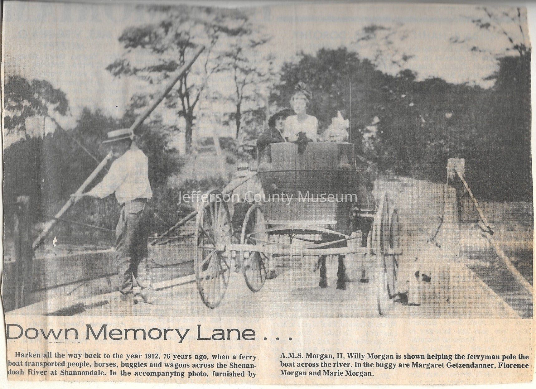 IMG3908118: Horse and carriage on Shenandoah Ferry, 1912. Willy Morgan is helping the ferryman pole the boat across the river. In the carriage are Margaret Getzendanner, Florence Morgan, Marie Morgan.