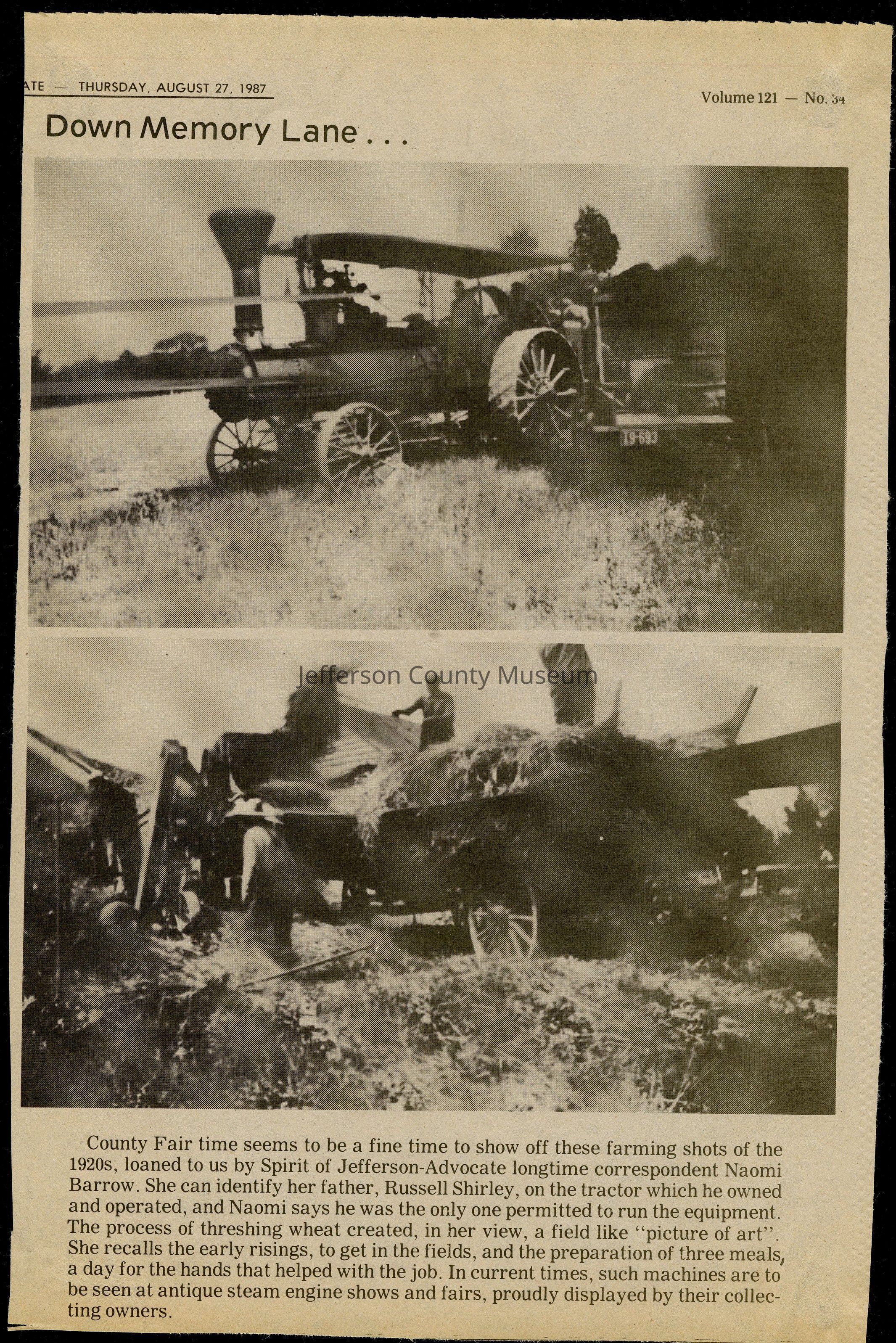 IMG3908061: Top photo: Russell Shirley on tractor at his farm, circa 1920s. Bottom photo: Farm hands with wagon full of hay on Russell Shirely's farm, circa 1920s.