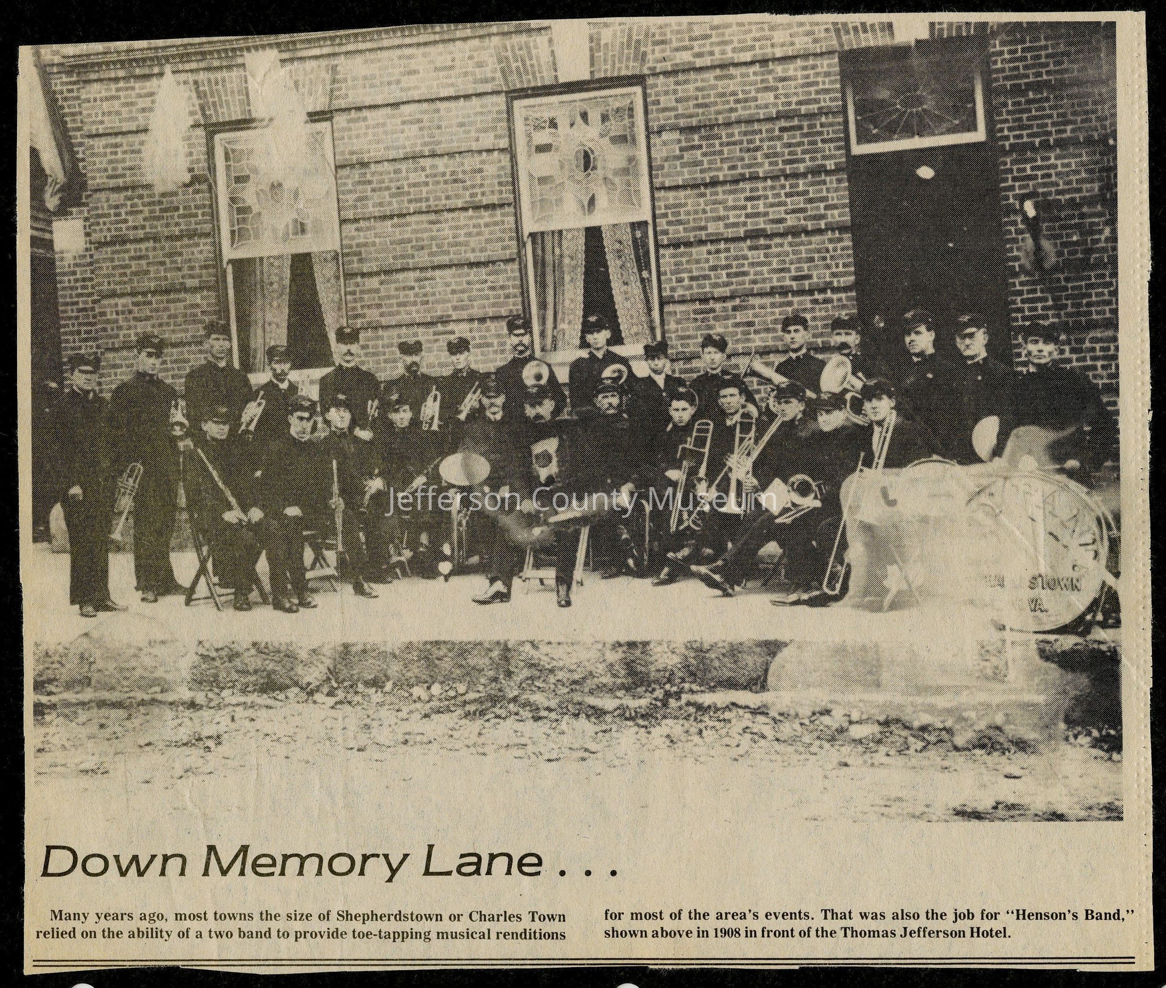 IMG3908066: Henson's Band, in front of the Thomas Jefferson Hotel in Charles Town, 1908.