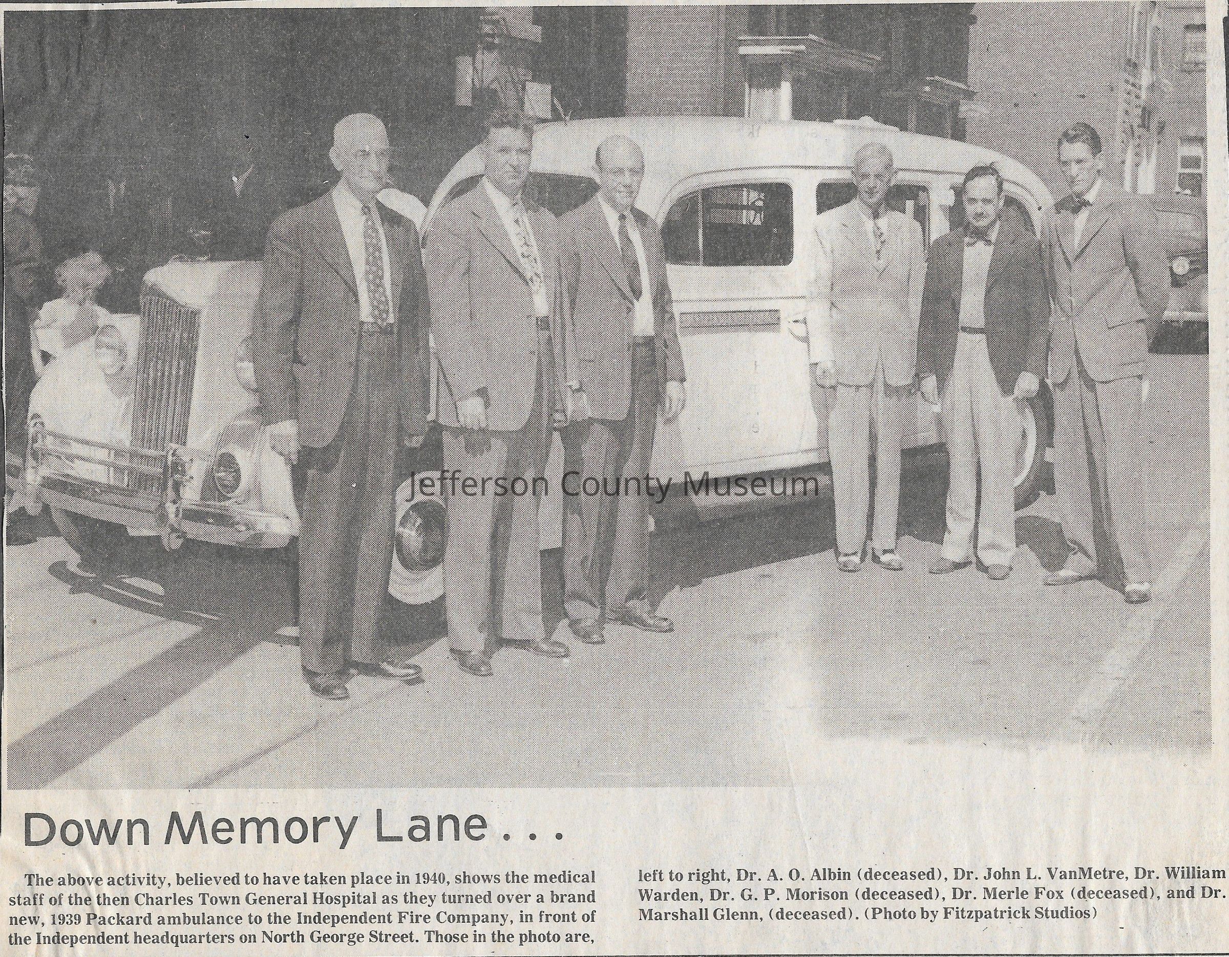 IMG3908074: Charles Town General Hospital medical staff giving 1939 Packard ambulance to the Independent Fire Company, in front of Independent Fire Company on North George Street in Charles Town, 1940. From left: Dr. A. O. Albin, Dr. John L. VanMetre, Dr. William Warden, Dr. G. P. Morison, Dr. Merle Fox, Dr. Marshall Glenn.