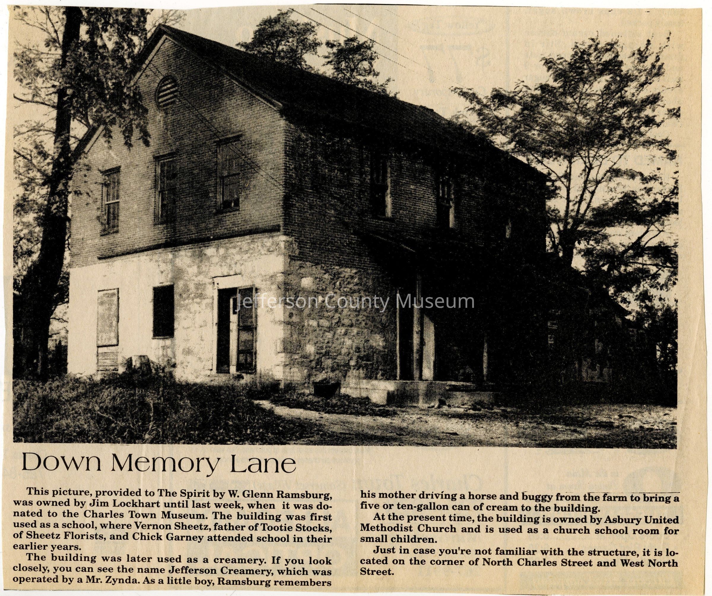 IMG3908082: Jefferson Creamery, located on corner of North Charles and West North Streets in Charles Town. The building was first used as a school; then Jefferson Creamery, operated by Mr. Zynda; then Asbury United Methodist Church.