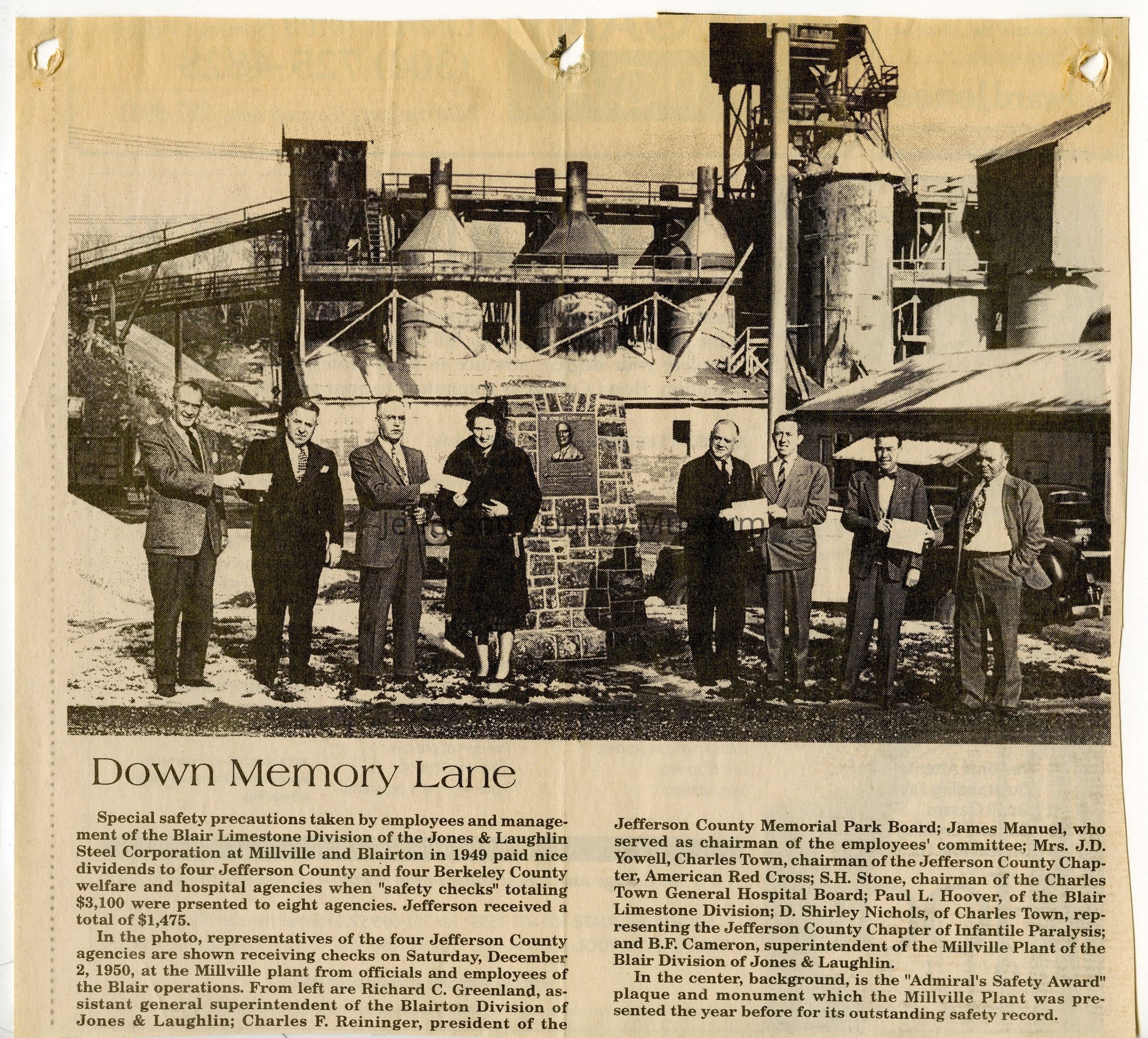 IMG3908094: Representatives of four Jefferson County welfare and hospital agencies receiving safety checks from officials and employees of the Blair Limestone Division of the Jones & Laughlin Steel Corporation at Millville and Blairton, at the Millville plant, on December 2, 1950. From left: Richard C. Greenland, assistant general superintendent of the Blairton Division of Jones & Laughlin; Charles F. Reininger, president of the Jefferson County Memorial Park Board; James Manuel, chairman of the employees' committee; Mrs. J. D. Yowell, Charles Town, chairman of the Jefferson County Chapter, American Red Cross; S. H. Stone, chairman of the Charles Town General Hospital Board; Paul L. Hoover, of Blair Limestone Division; D. Shirley Nichols, Charles Town, representing the Jefferson County Chapter of Infantile Paralysis; B. F. Cameron, superintendent of Millville Plant of the Blair Division of Jones & Laughlin. In the center, background, is the "Admiral's Safety Award" plaque and monument which the Millville Plant was presented the year before for its outstanding safety record.