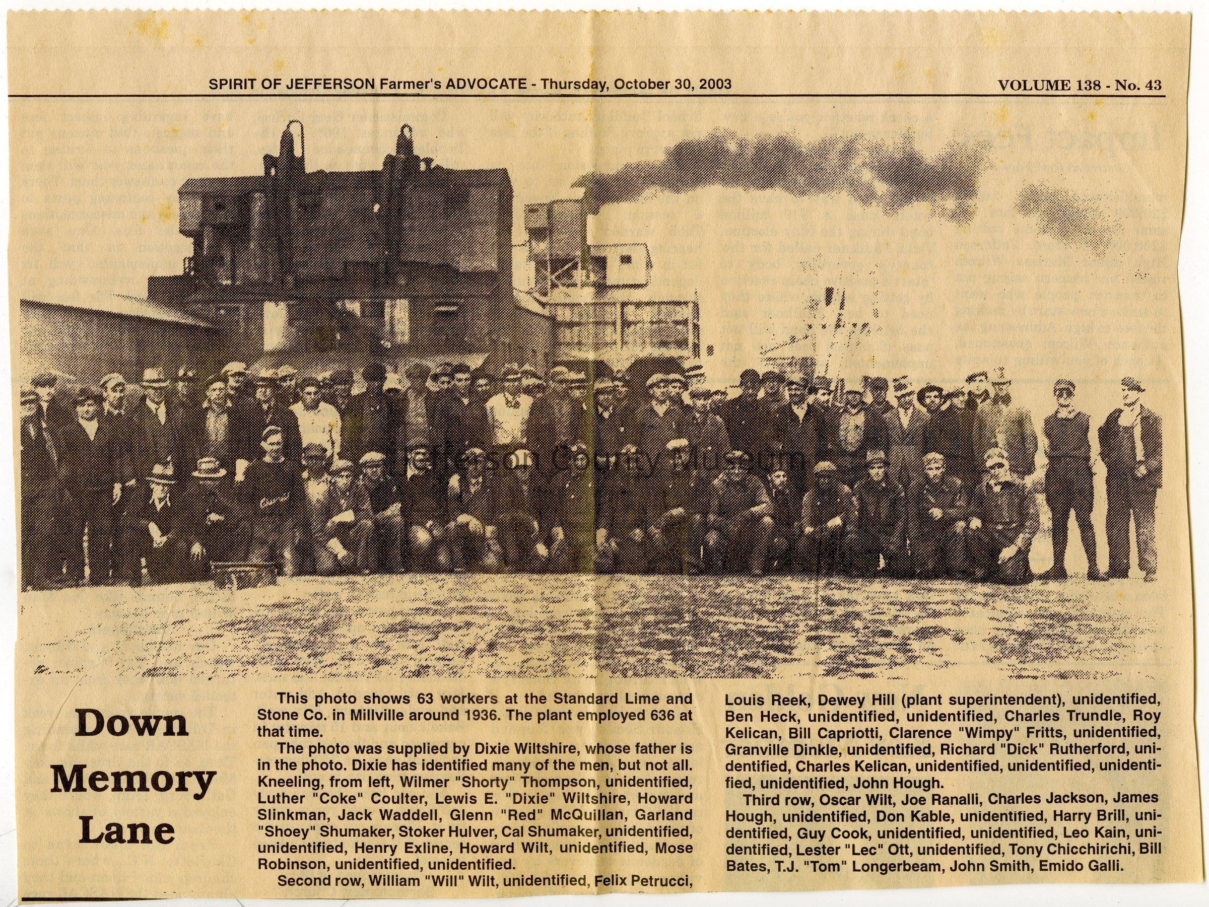 IMG3908095: Sixty-three workers at Standard Lime and Stone Company in Millville, circa 1936. Front row, from left: Wilmer "Shorty" Thompson, unidentified, Luther "Coke" Coulter, Lewis E. "Dixie" Wiltshire, Howard Slinkman, Jack Waddell, Glenn "Red" McQuillan, Garland "Shoey" Shumaker, Stoker Hulver, Cal Shumaker, unidentified, unidentified, Henry Exline, Howard Wilt, unidentified, Mose Robinson, unidentified, unidentified. Second row, from left: William "Will" Wilt, unidentified, Felix Petrucci, Louis Reek, Dewey Hill (plant superintendent), unidentified, Ben Heck, unidentified, unidentified, Charles Trundle, Roy Kelican, Bill Capriotti, Clarence "Wimpy" Fritts, unidentified, Granville Dinkie, unidentified, Richard "Dick" Rutherford, unidentified, Charles Kelican, unidentified, unidentified, unidentified, unidentified, John Hough. Third row, from left: Oscar Wilt, Joe Ranalli, Charles Jackson, James Hough, unidentified, Don Kable, unidentified, Harry Brill, unidentified, Guy Cook, unidentified, unidentified, Leo Kain, unidentified, Lester "Lec" Ott, unidentified, Tony Chicchirichi, Bill Bates, T. J. "Tom" Longerbeam, John Smith, Emido Galli.