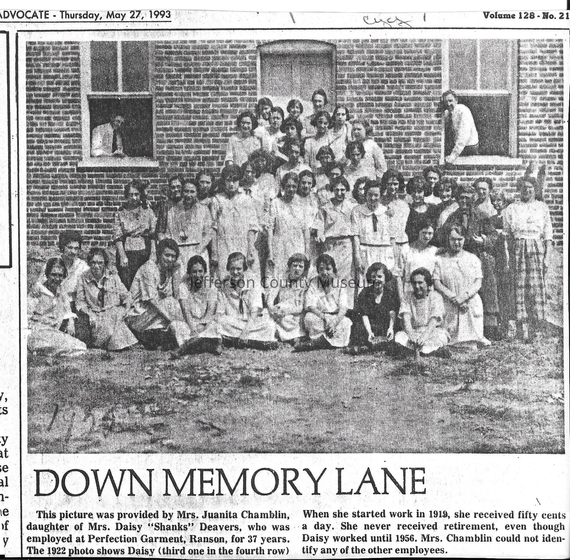 IMG3908101: Employees at Perfection Garment Company, located at Third Avenue and Fairfax Boulevard in Ranson, 1922. Fourth row, third from left, is Daisy "Shanks" Deavers, who worked at Perfection Garment from 1919 to 1956.