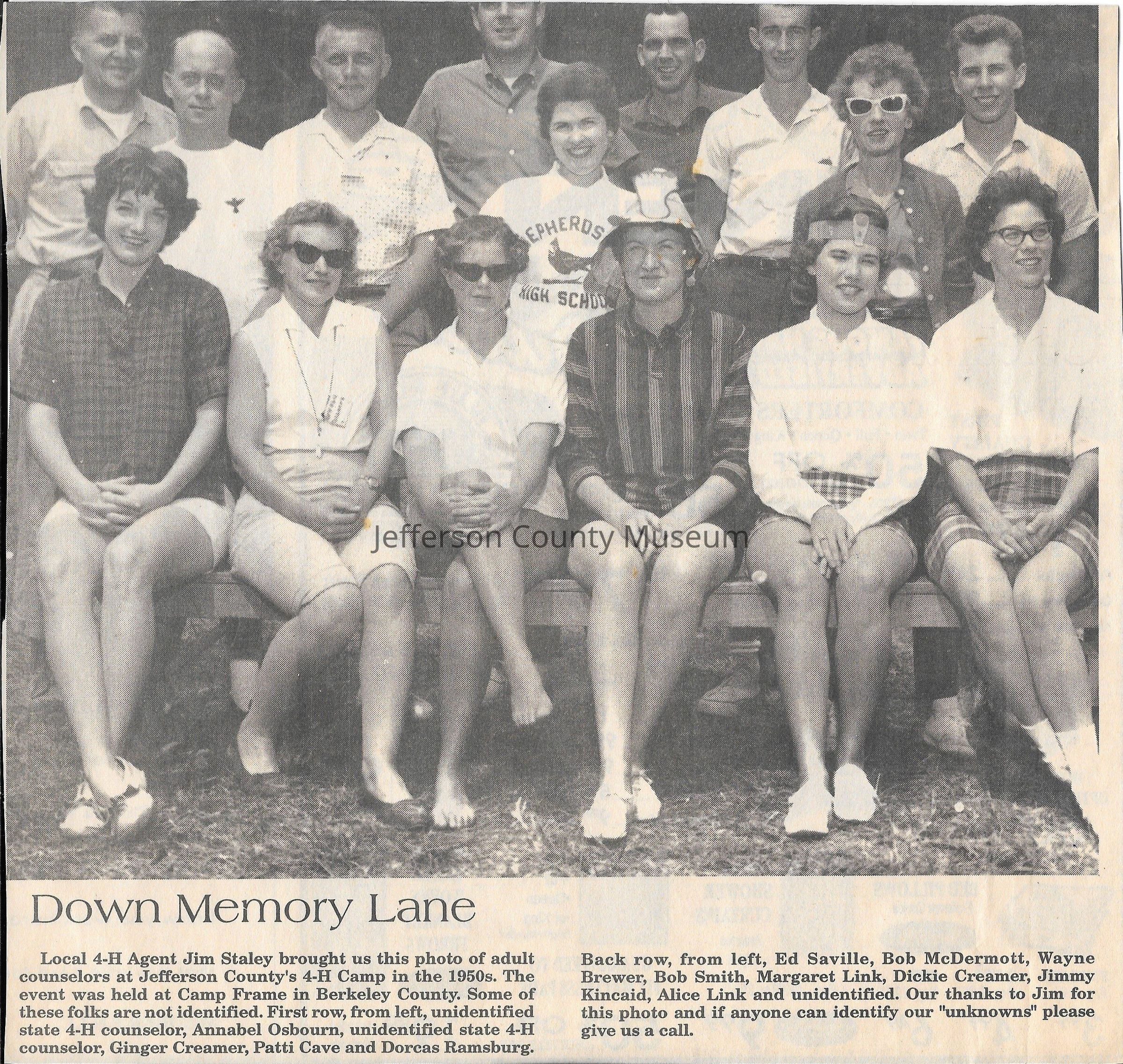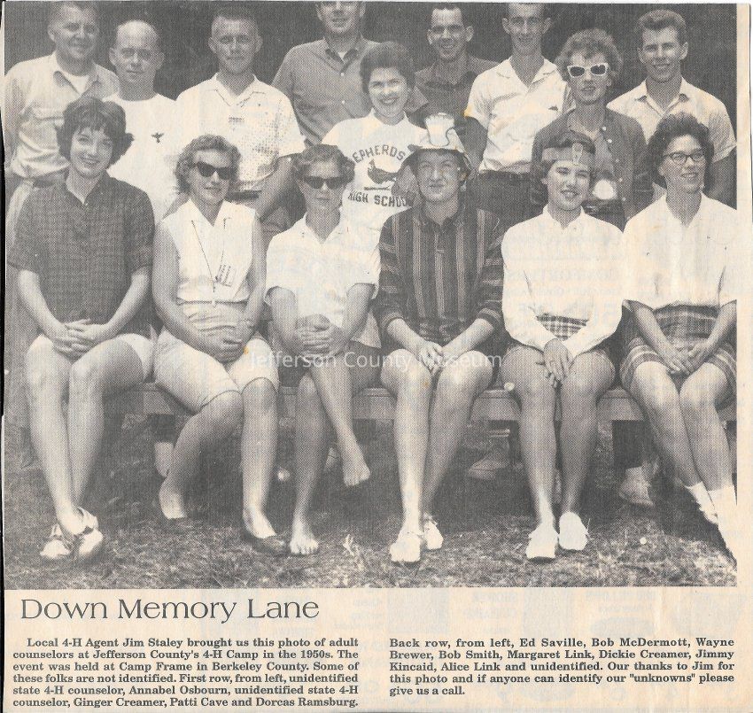 IMG3908001: Adult counselors at Jefferson County's 4-H Camp, at Camp Frame in Berkeley County, circa 1950s. First row, from left: unidentified, Annabel Osbourn, unidentified, Ginger Creamer, Patti Cave, Dorcas Ramsburg. Back row, from left: Ed Saville, Bob McDermott, Wayne Brewer, Bob Smith, Margaret Link, Dickie Creamer, Jimmy Kincaid, Alice Link, unidentified.