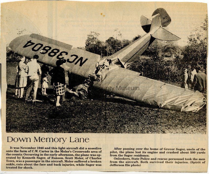 IMG3908005: Aircraft landed at C. W. Carter's farm near Moler's Crossroads, November 1946. Plane operated by Kenneth Sager. Scott Moler was a passenger.