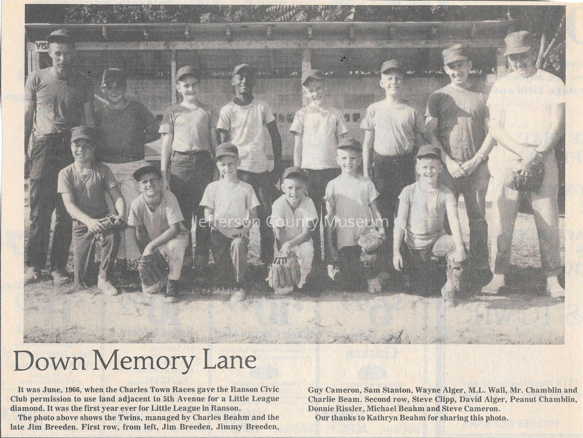 IMG3908109: Little League Twins baseball team, June 1966. Charles Town Races gave the Ranson Civic Club permission to use land adjacent to 5th Avenue for a Little League diamond. The Twins baseball team was managed by Charles Beahm and Jim Breeden. First row, from left: Jim Breeden, Jimmy Breeden, Guy Cameron, Sam Stanton, Wayne Alger, M. L. Wall, Mr. Chamblin, Charlie Beam. Second row, from left: Steve Clipp, David Alger, Peanut Chamblin, Donnie Rissler, Michael Beahm, Steve Cameron.