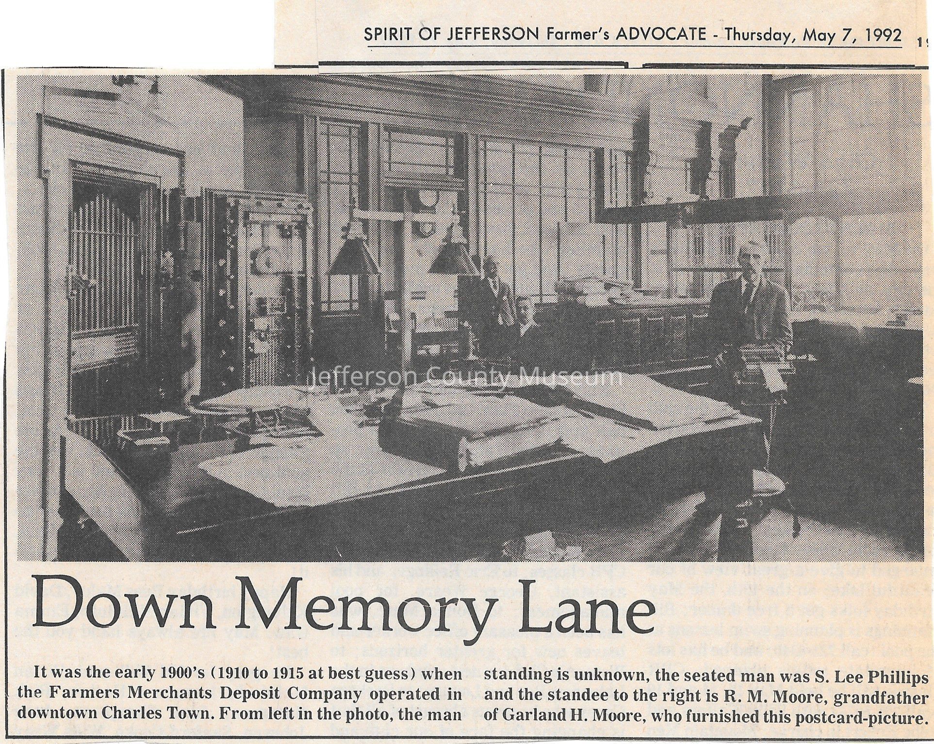 IMG3908012: Farmers Merchants Deposit Company, located in Charles Town, circa early 1900s. From left to right: unidentified, S. Lee Phillips, R. M. Moore.