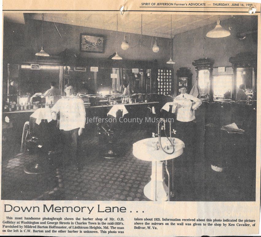 IMG3908014: O. B. Golliday's Barber Shop, located at Washington and George Streets in Charles Town, circa 1925. On left is C. W. Barton.