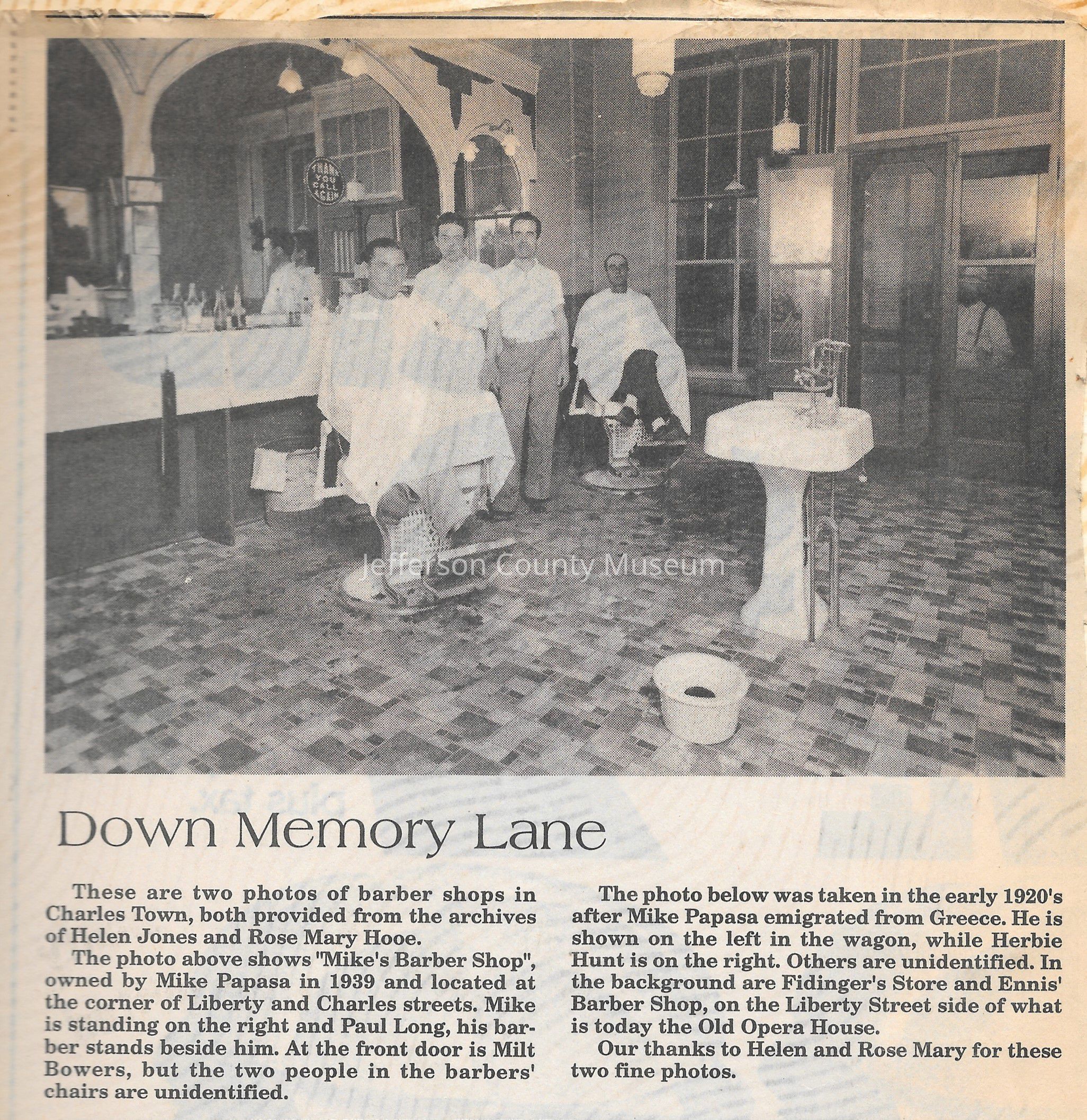 IMG3908016: Mike's Barber Shop, located at corner of Liberty and Charles Streets in Charles Town, 1939. Standing from left to right: Paul Long; Mike Papasa, owner. Two people sitting in barber chairs are unidentified. Man at front door is Milt Bowers.