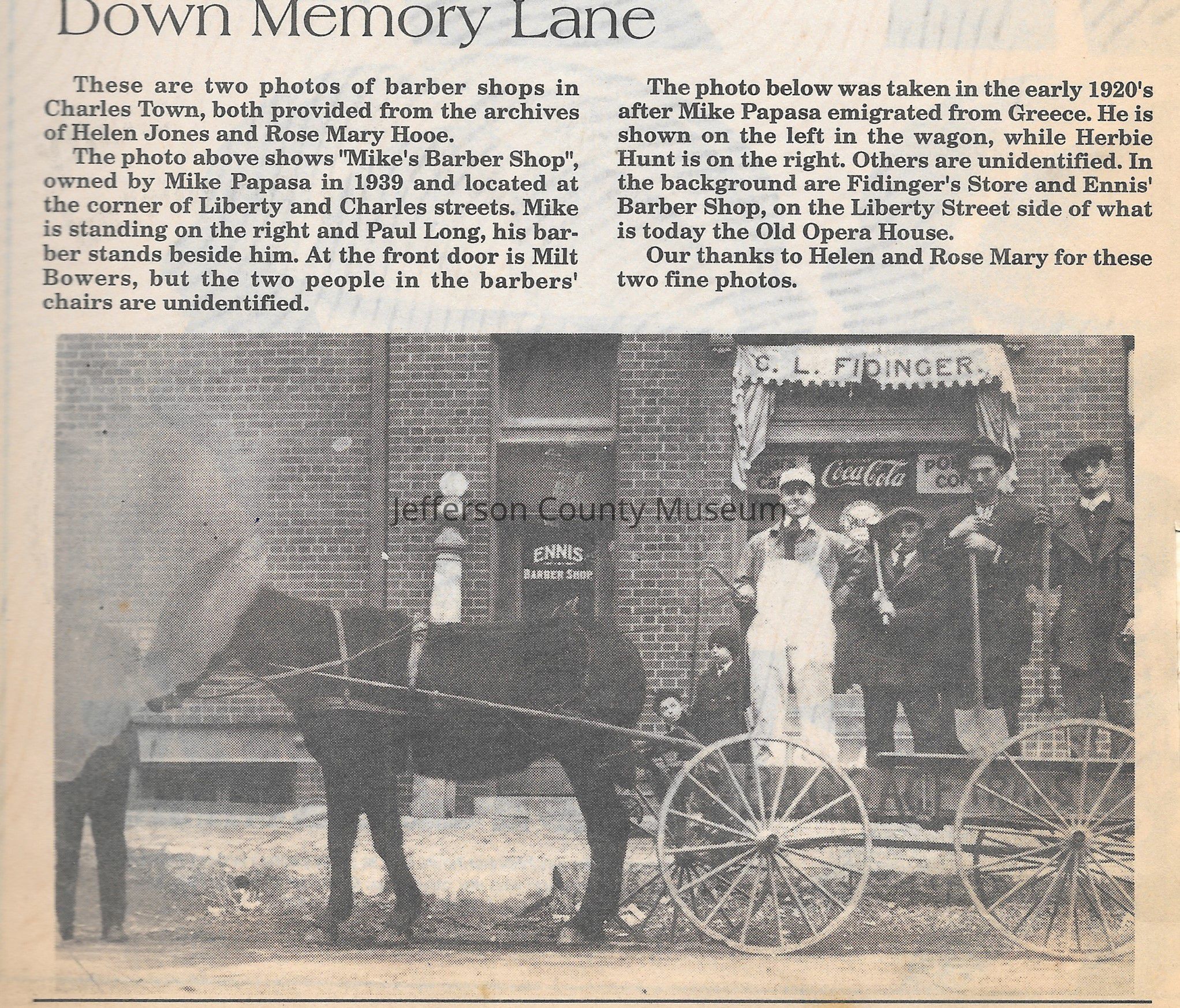 IMG3908017: Horse and wagon in front of Ennis' Barber Shop and C. L. Fidinger's Store, on Liberty Street in Charles Town, circa 1920s. Standing in wagon from left to right is: Mike Papasa, a barber; Herbie Hunt; unidentified; unidentified.