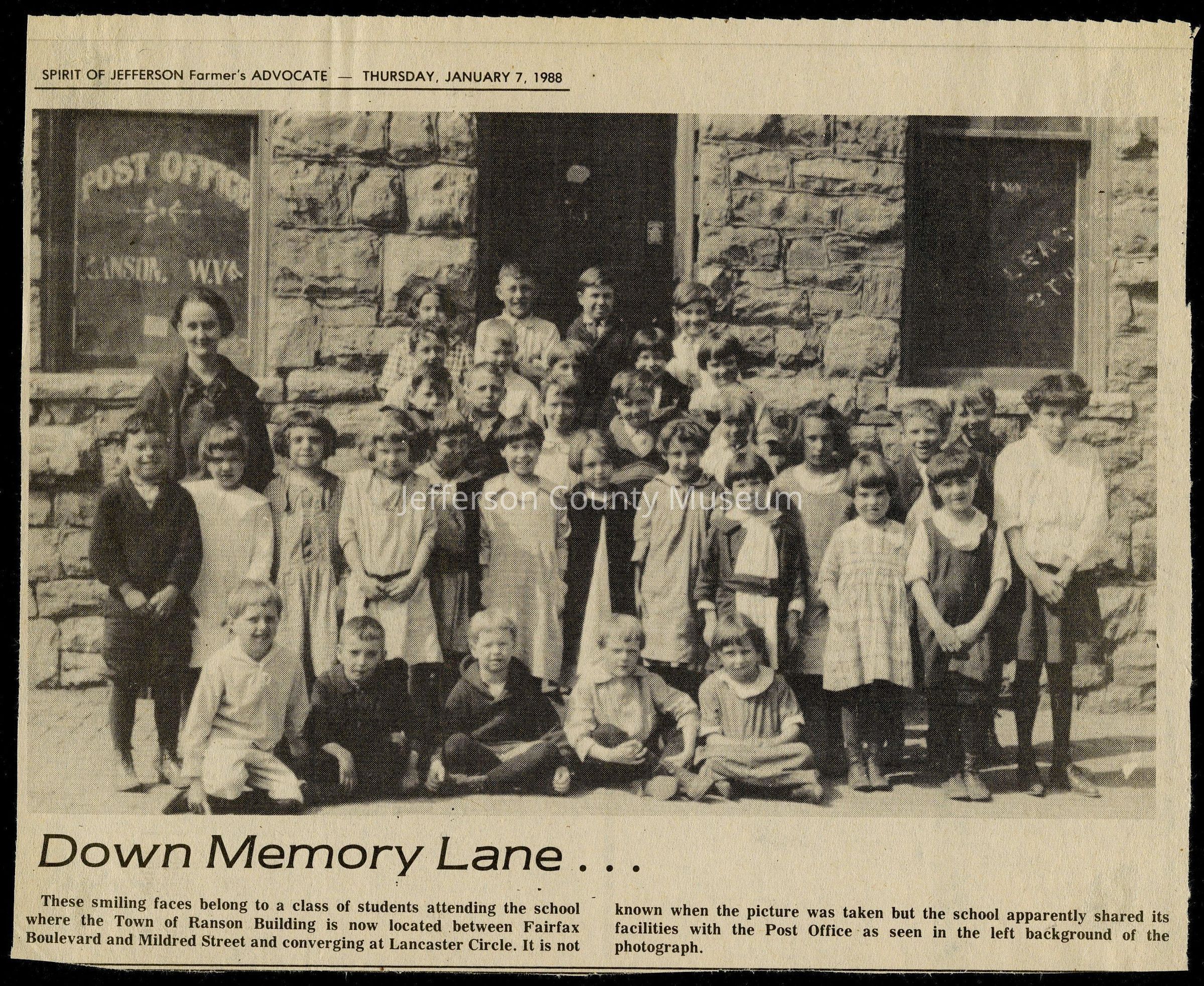 IMG3908112: 5th grade students at Ranson Elementary School with teacher Ollie Blessing. On window behind teacher is Post Office, Ranson, West Virginia. According to the museum historian, the Post Office was located at what is today the City of Ranson building on the corner of South Mildred and 3rd Avenue. Ranson Elementary was located there until a new school on 5th Avenue was built.