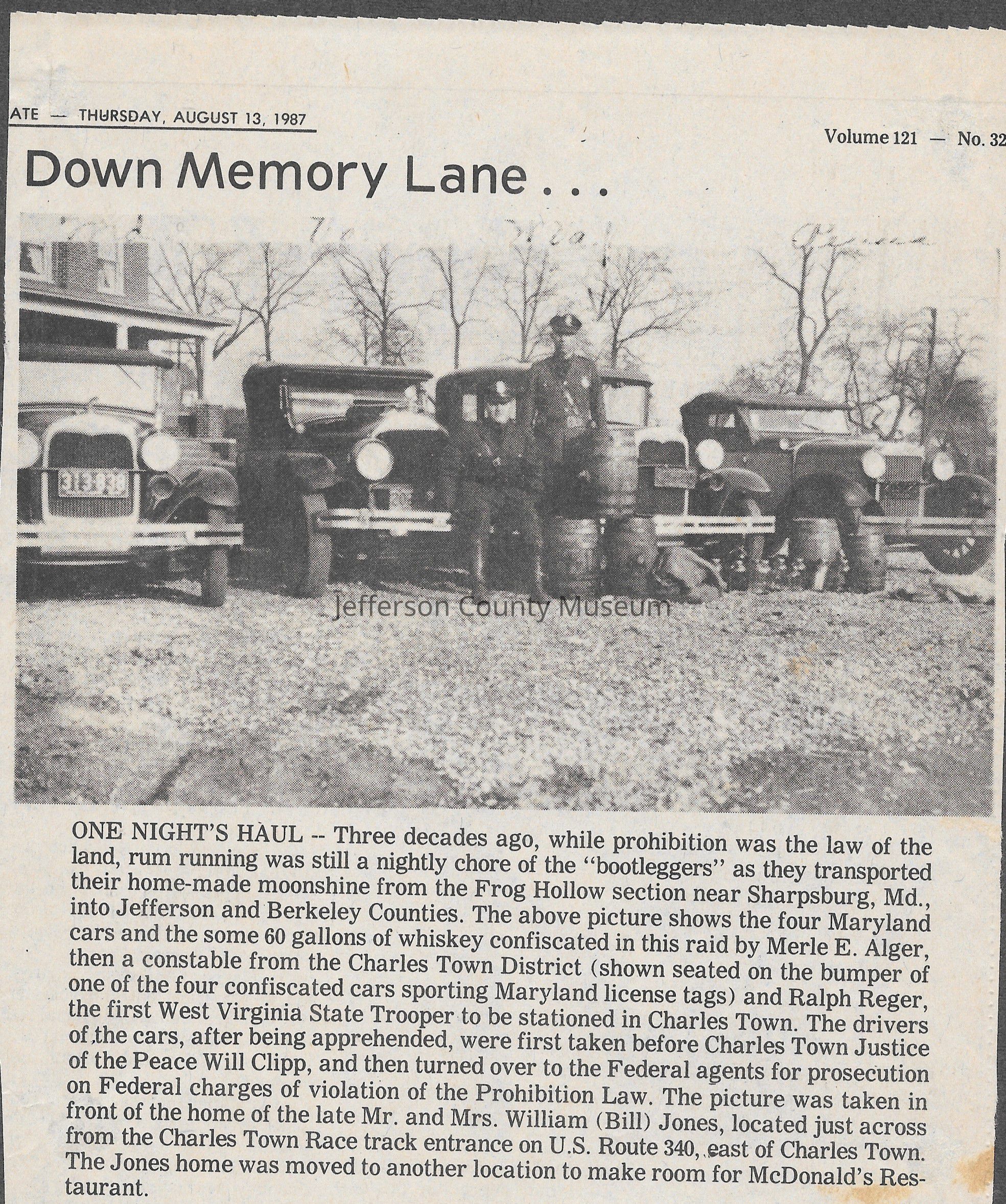 IMG3908020: Sixty gallons of whiskey and four cars parked in front of the home of Mr. and Mrs. William (Bill) Jones, located across from the Charles Town Race Track. Merle E. Alger, Charles Town constable, (shown seated on bumper of car) and Ralph Reger, first West Virginia State Trooper stationed in Charles Town, confiscated the whiskey and cars from bootleggers intending to transport their homemade moonshine from the Frog Hollow section near Sharpsburg, Md., into Jefferson and Berkeley Counties, circa 1930s.