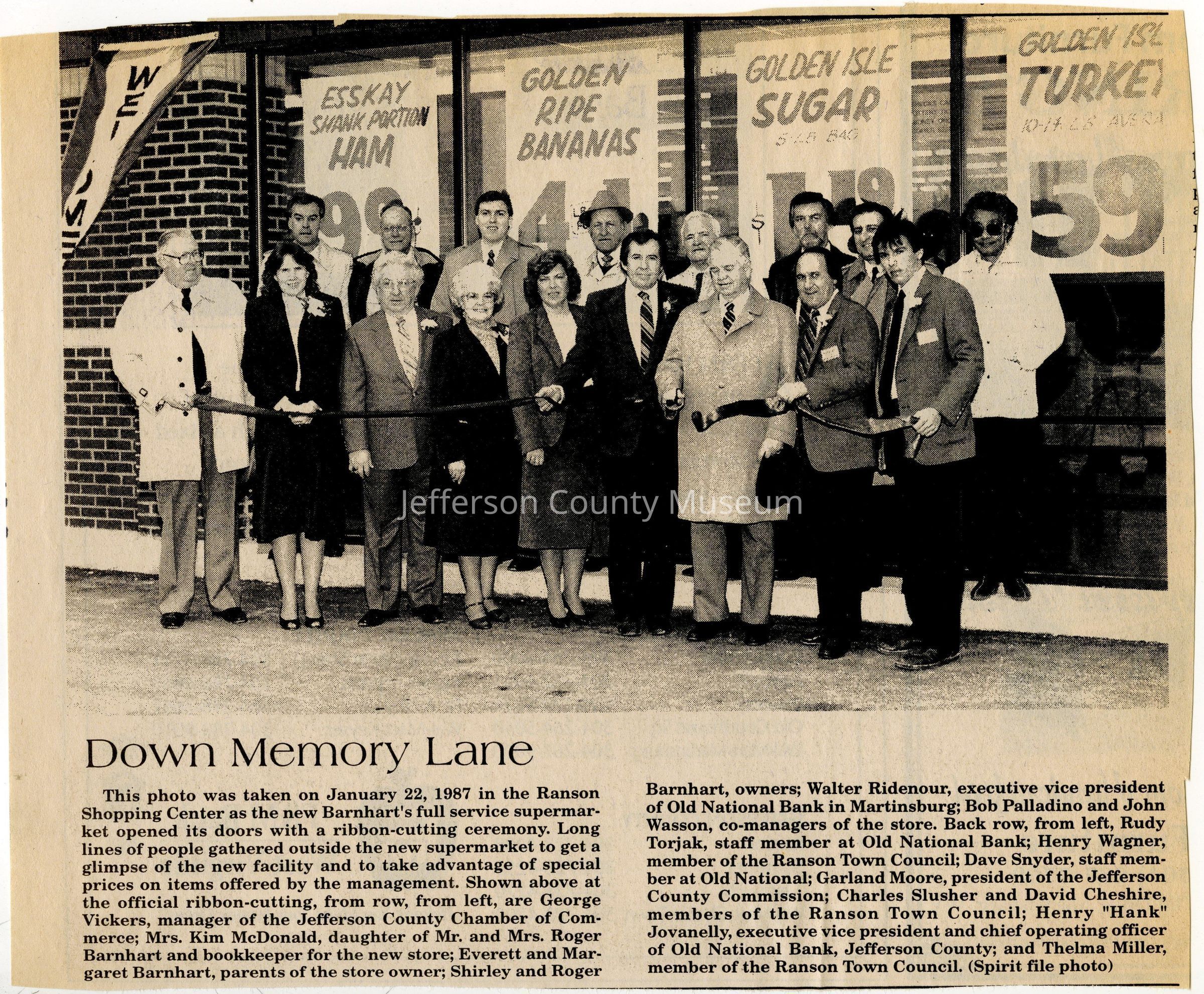 IMG3908113: Individuals standing in front of Ranson Shopping Center on opening day, January 22, 1987. Front row, from left: George Vickers, manager of the Jefferson County Chamber of Commerce; Mrs. Kim McDonald, daughter of Mr. and Mrs. Roger Barnhart and bookkeeper for the new store; Everett Barnhart, father of Roger Barnhart; Margaret Barnhart, mother of Roger Barnhart; Shirley Barnhart, store owner; Roger Barnhart, store owner; Walter Ridenour, executive vice president of Old National Bank in Martinsburg; Bob Palladino, co-manager of store; John Wasson, co-manager of store. Back row, from left: Rudy Torjak, staff member at Old National Bank in Martinsburg; Henry Wagner, member of the Ranson Town Council; Dave Snyder, staff member at Old National Bank in Martinsburg; Garland Moore, president of the Jefferson County Commission; Charles Slusher, member of the Ranson Town Council; David Cheshire, member of the Ranson Town Council; Henry "Hank" Jovanelly, executive vice president and chief operating officer of Old National Bank, Jefferson County; Thelma Miller, member of the Ranson Town Council.