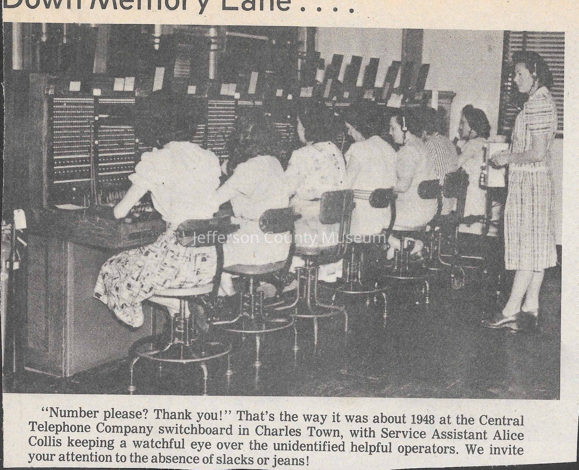 IMG3908023: Central Telephone Company switchboard in Charles Town, 1948. Standing on far right is Alice Collis, Service Assistant.