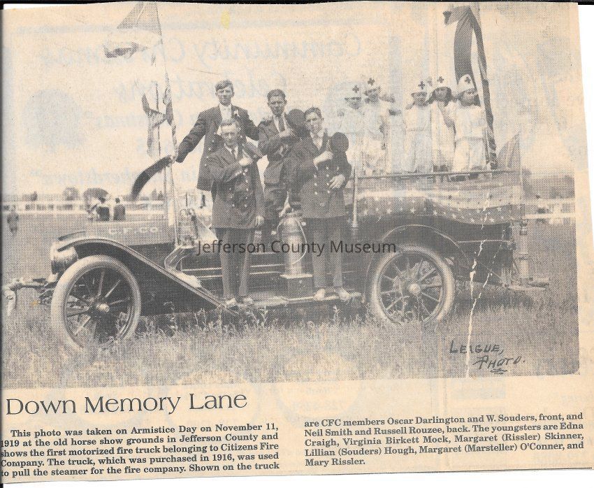 IMG3908027: Citizens Fire Company's first motorized fire truck at the old horse show grounds in Jefferson County, November 11, 1919. Front row, from left: Oscar Darlington, W. Souders. Back row, from left: Neil Smith, Russell Rouzee, Edna Craigh, Virginia Birkett Mock, Margaret (Rissler) Skinner, Lillian (Souders) Hough, Margaret (Marsteller) O'Conner, Mary Rissler.