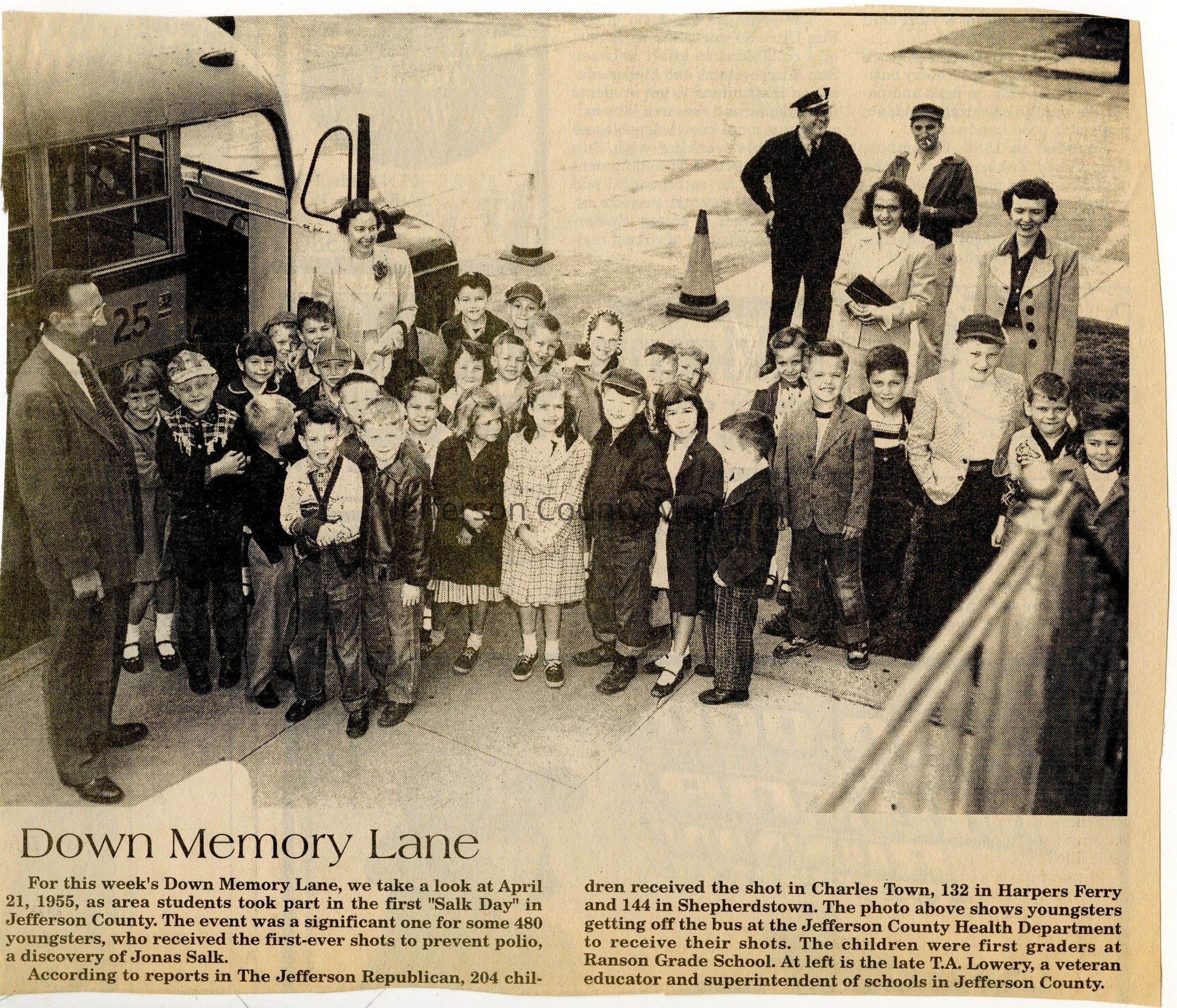 IMG3908116: First grade students from Ranson Elementary School getting off the bus at the Jefferson County Health Department to receive vaccine shots to prevent polio, "Salk Day," April 21, 1955. On far left is T. A. Lowery, superintendent of schools in Jefferson County.