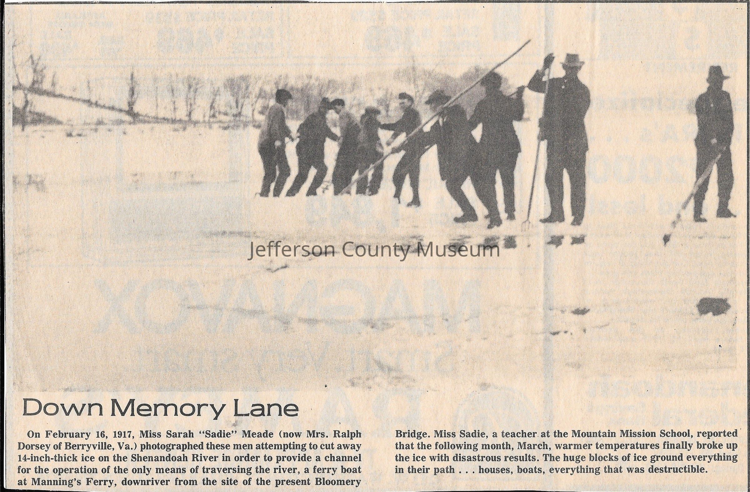 IMG3908119: Individuals cutting away 14 inch thick ice on the Shenandoah River in order to provide a channel for the operation of the only means of traversing the river, a ferry boat at Manning's Ferry, February 16, 1917.