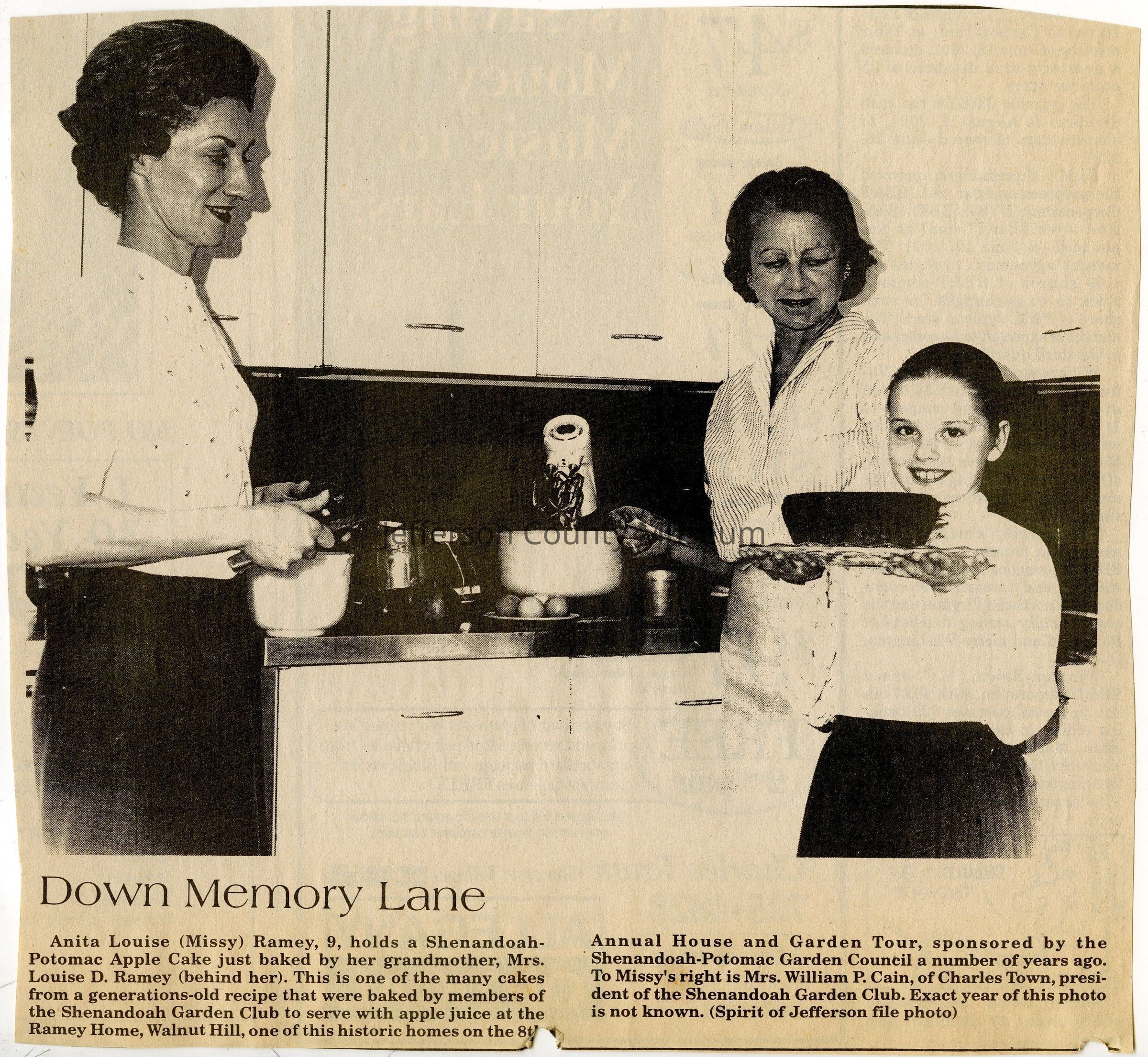 IMG3908120: Anita Louise (Missy) Ramey, 9 years old, holding a Shenandoah-Potomac apple cake baked by her grandmother, Louise D. Ramey, standing behind her. This is one of the many cakes from a generations old recipe that were baked by members of the Shenandoah Garden Club to serve with apple juice at the Ramey Home, Walnut Hill, one of the historic homes on the 8th Annual House and Garden Tour, sponsored by the Shenandoah-Potomac Garden Council. On left is Mrs. William P. Cain, president of the Shenandoah Garden Club.