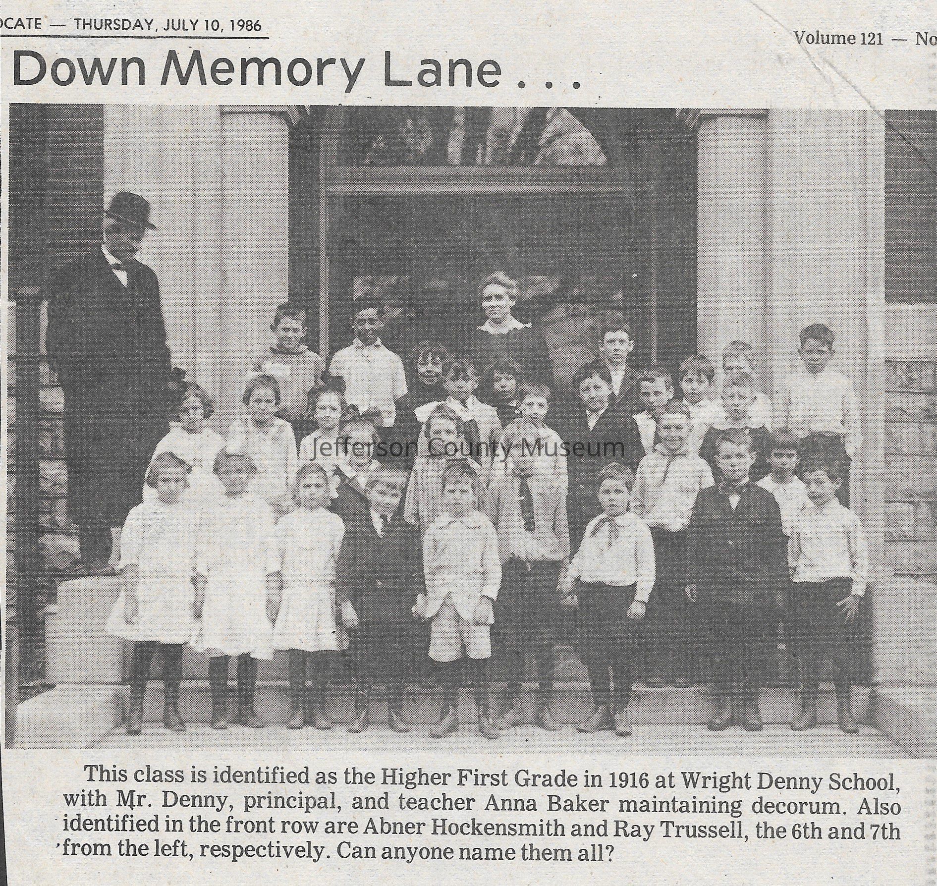 IMG3908036: Wright Denny School's Higher First Grade class, 1916. Far left is Wright Denny, principal. Far back, in middle, is Anna Baker, teacher. Front row, sixth from left, is Abner Hockensmith. Front row, seventh from left, is Ray Trussell.