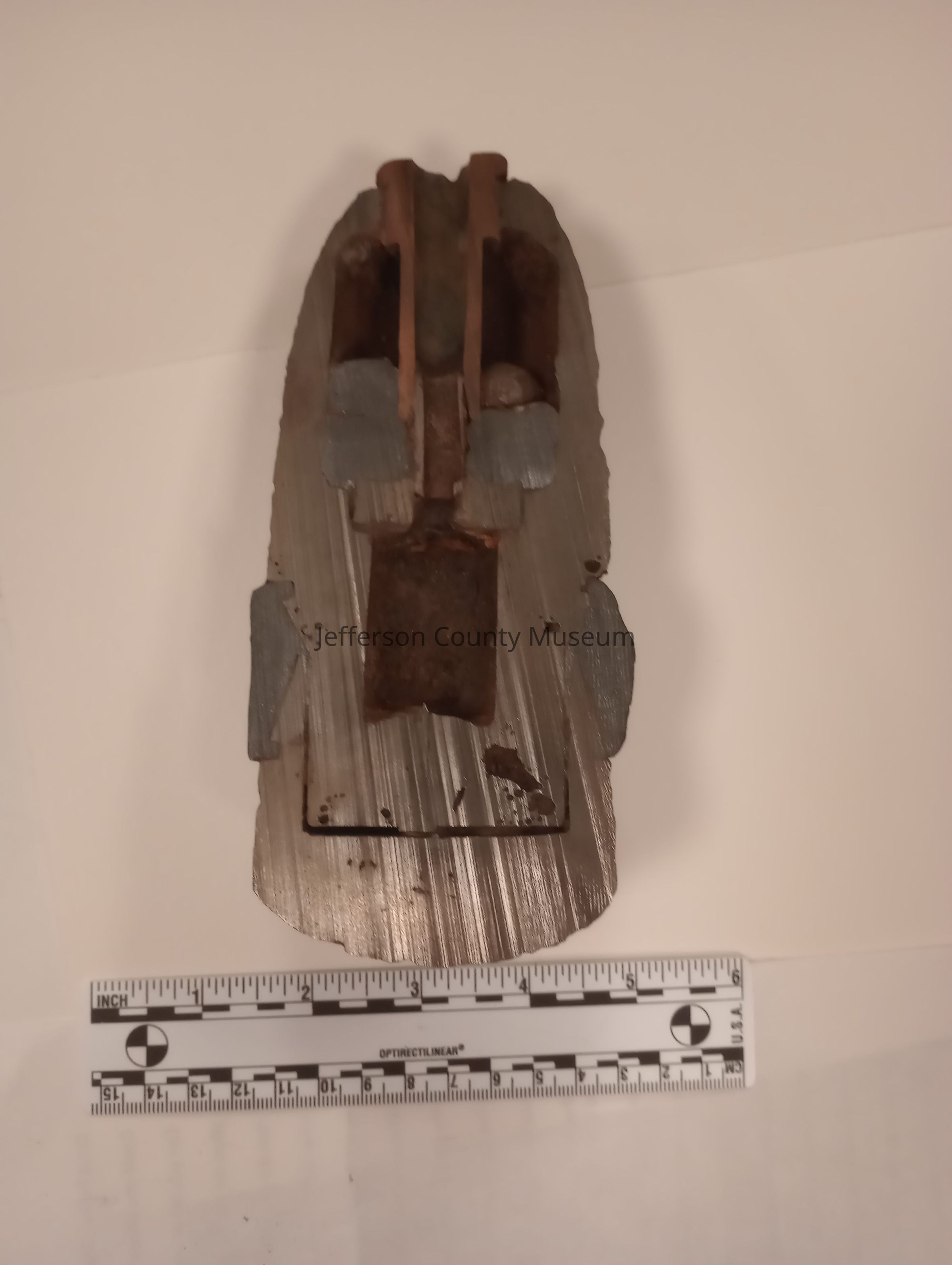 Hotchkiss case shot shell sawed in half lengthwise. Fuse is still in place and one or two balls can be seen within the hollow chamber.Acquisition