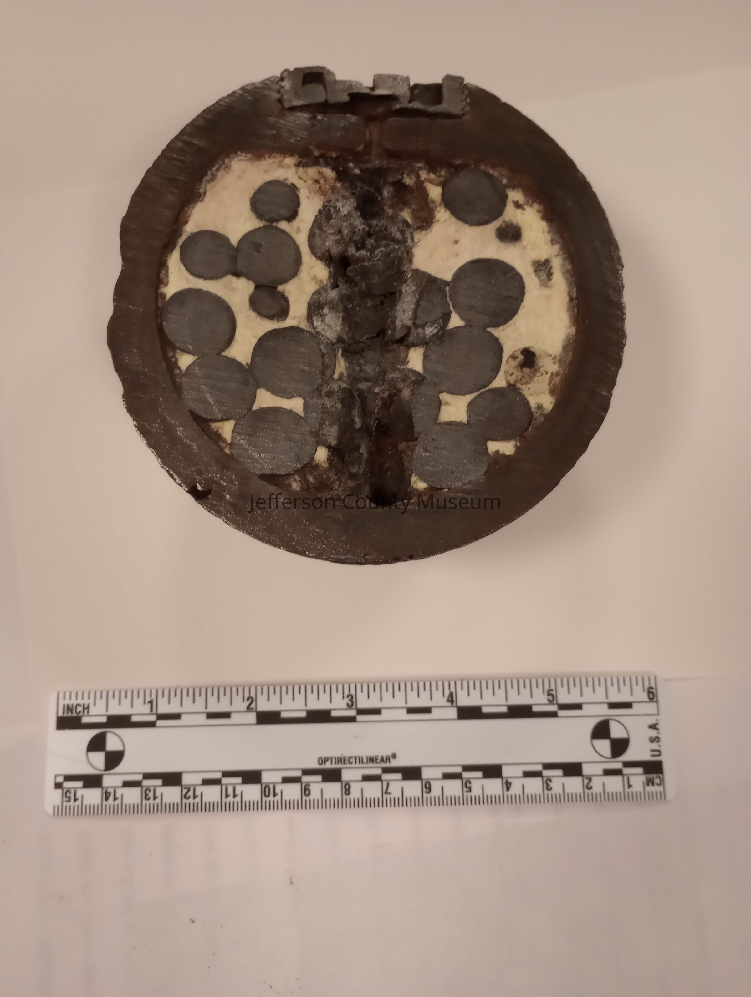 Twelve pound spherical case shot sawed in half. Interior still shows that half of the fuse is still intact and the balls that are packed inside the shell.Acquisition