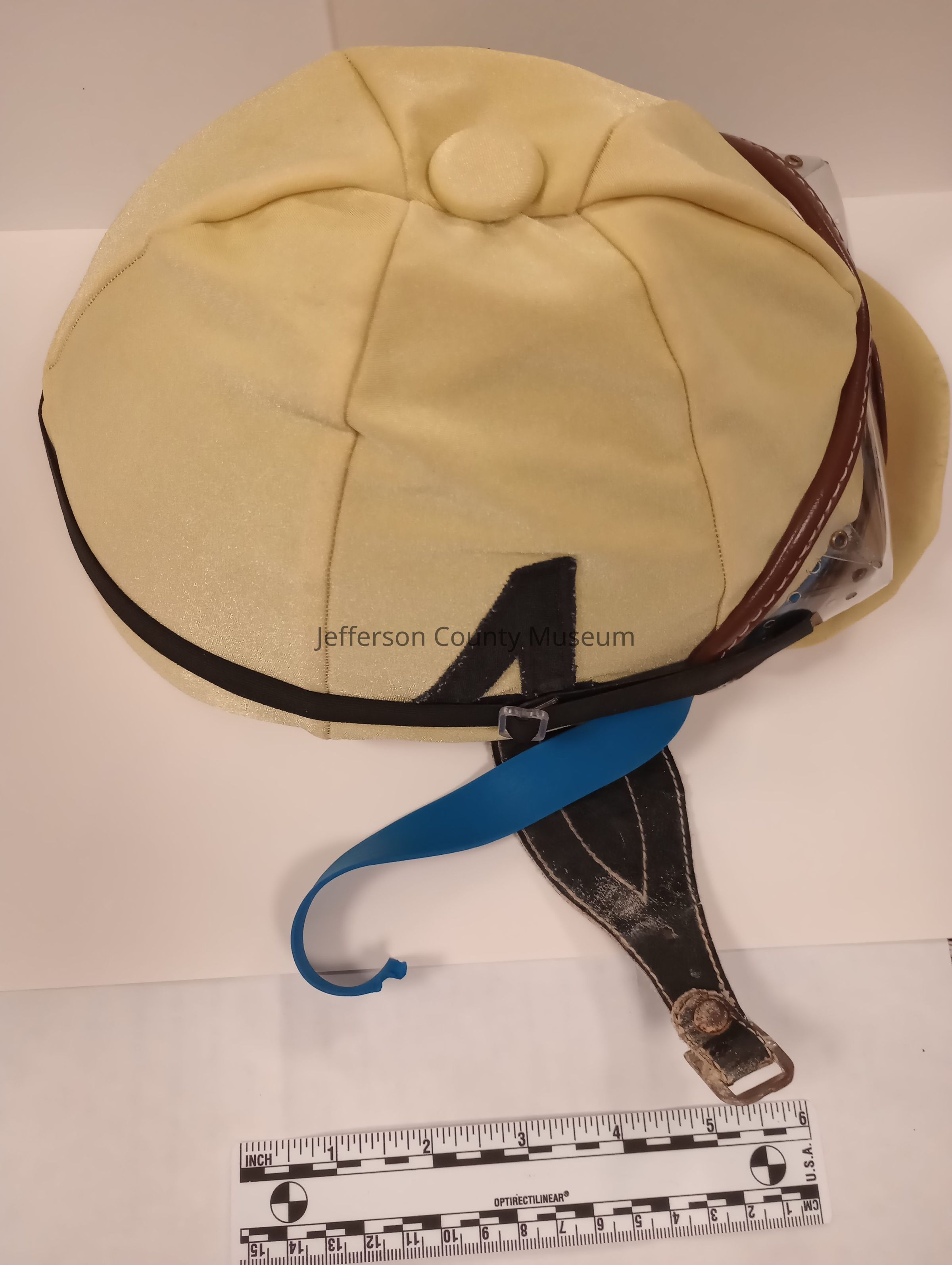 Jockey's helmet used at the Charles Town racetrack. Helmet is yellow and has goggles on it. Has a large number 4 in black and a broken rubber strap.Acquisition