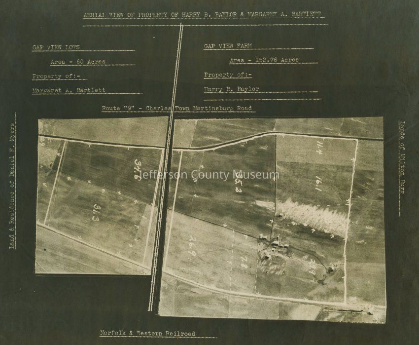 Realtor's aerial view of the Gap View Farm property showing boundaries, acreage, and location of buildings. Image stored as a jpeg.Acquisition