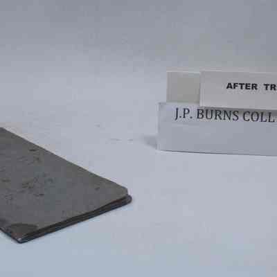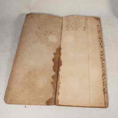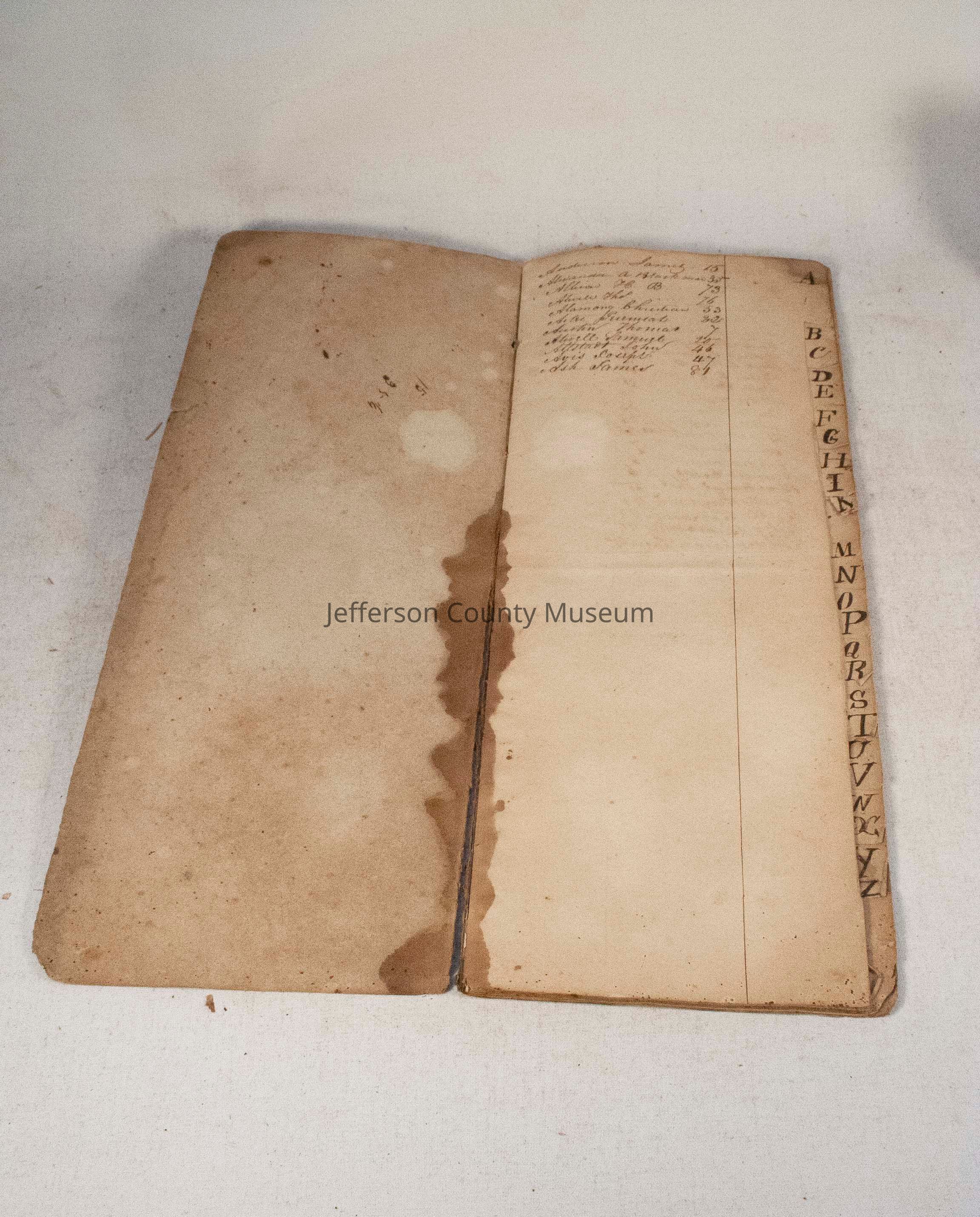 Handwritten on the outer front cover of this soft-bound book is Frame & Lock (see below) as well as partially legible words and numbers. Inside are unnumbered pages of an alphabetical list of names followed by a number. This book is likely an index to customers and the page numbers of their accounts recorded in a separate ledger. There are no dates in the book.