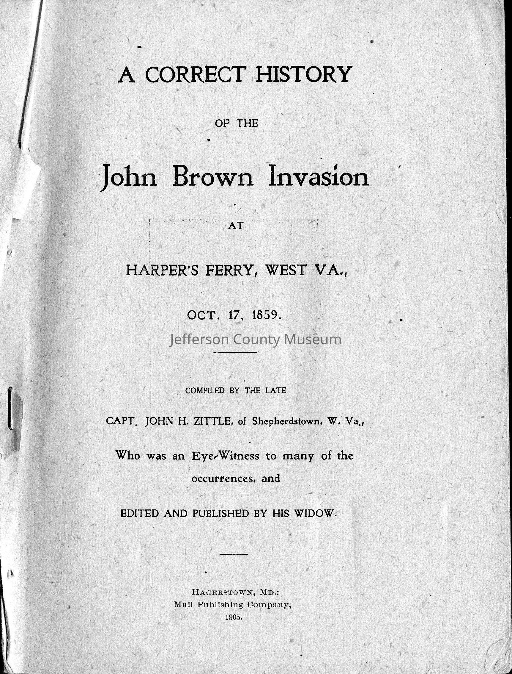 "A CORRECT HISTORY OF THE John Brown Invasion AT HARPERS FERRY, WEST, VA., OCT. 17, 1859. Compiled by the Late Capt. John H. Zittle, of Shepherdstown, W. Va." Mail Publishing Company, Hagerstown, MD, 1905.Acquisition
