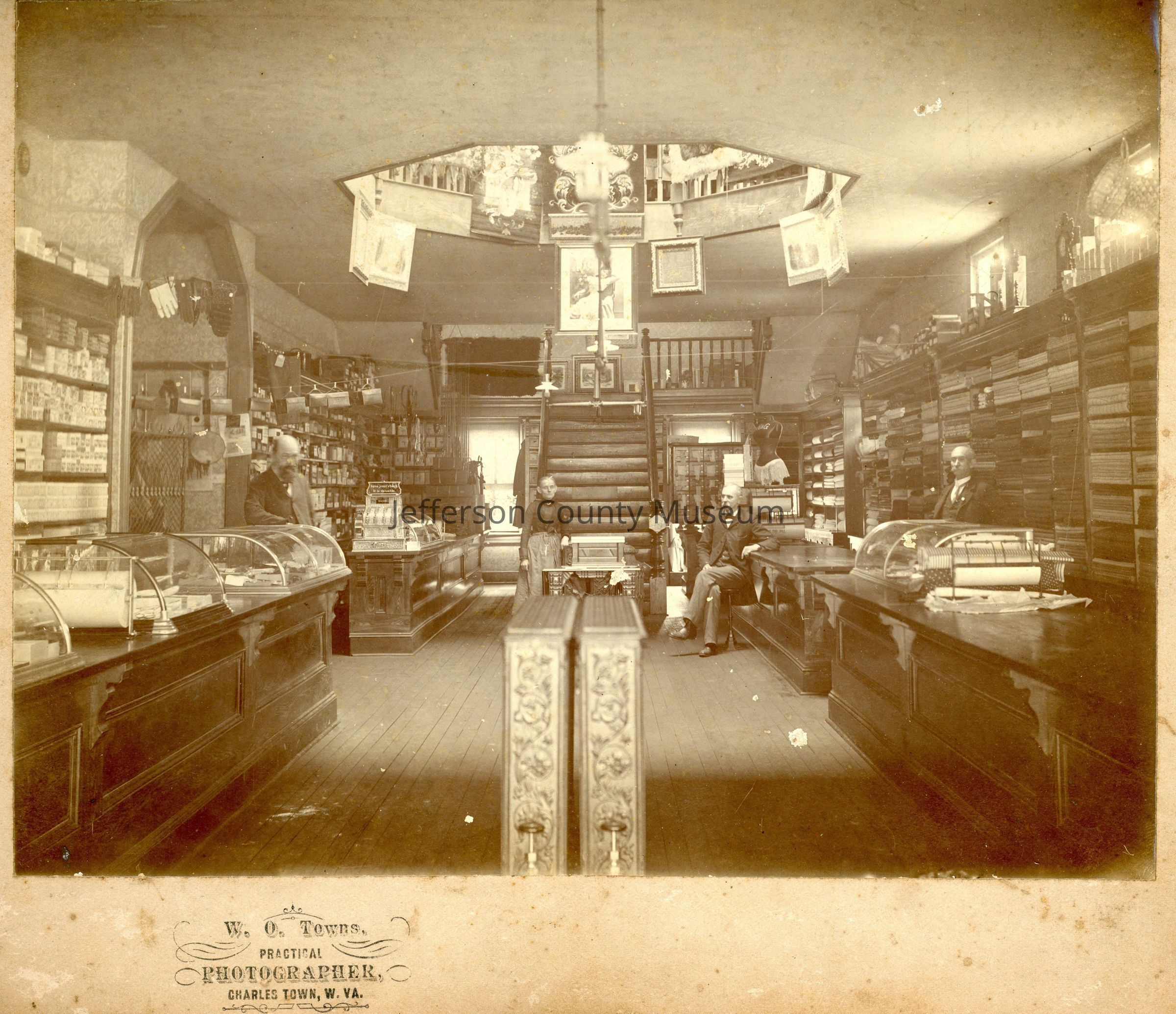 Black and white mounted photo of the interior of Coffman's Dry Goods store. Likely located at 118 N Charles Street. Visible is the staircase to the second floor and an ornate opening in the ceiling, with counters on either side displaying the store's wares. Pictured are the proprietor, Jacob W. Coffman, his sister Annie Coffman, his brother James A Coffman, and an unidentified man.Acquisition