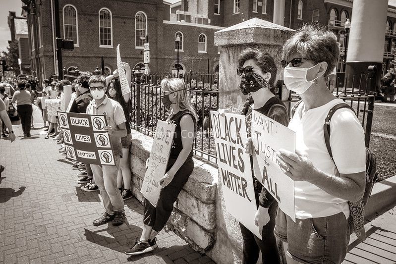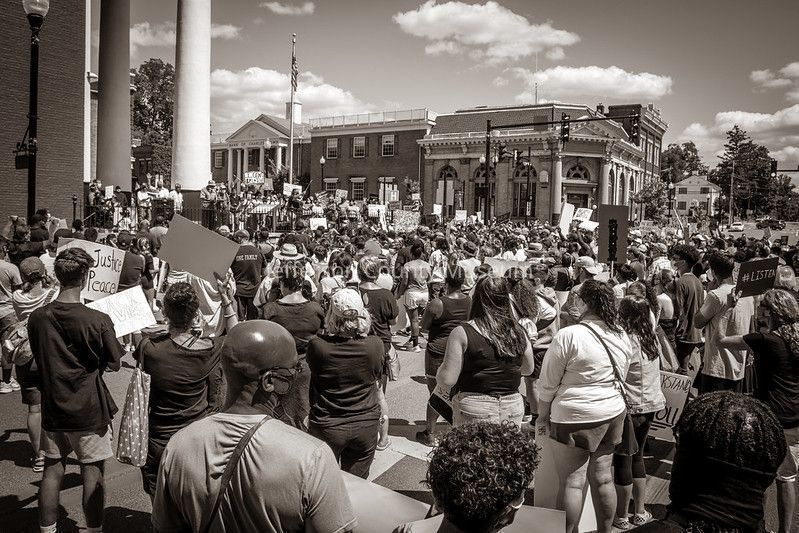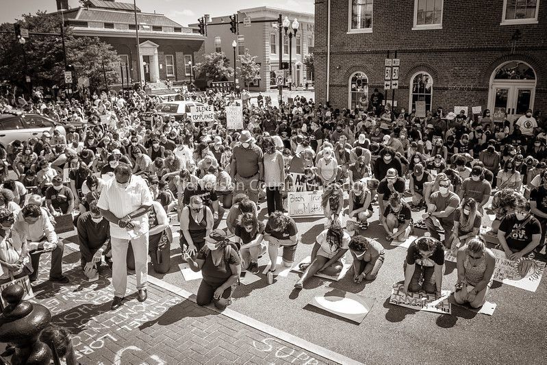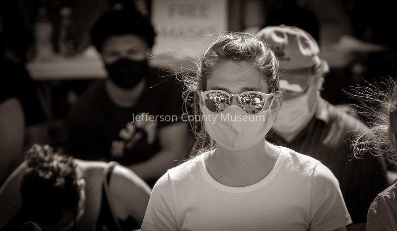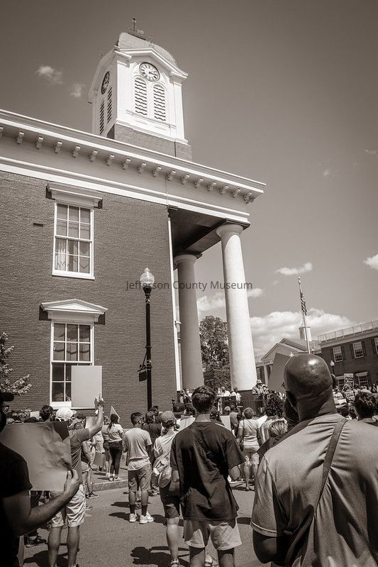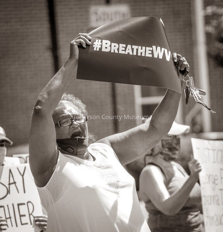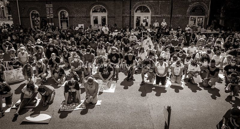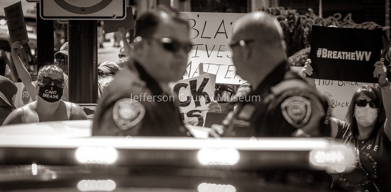 NAACP Black Lives Matter rally at intersection of George Street and Washington Street in Charles Town, on June 7, 2020. Crowds in front of Jefferson County Courthouse and Charles Town City Hall. Many individuals wearing masks due to COVID-19 pandemic.Acquisition